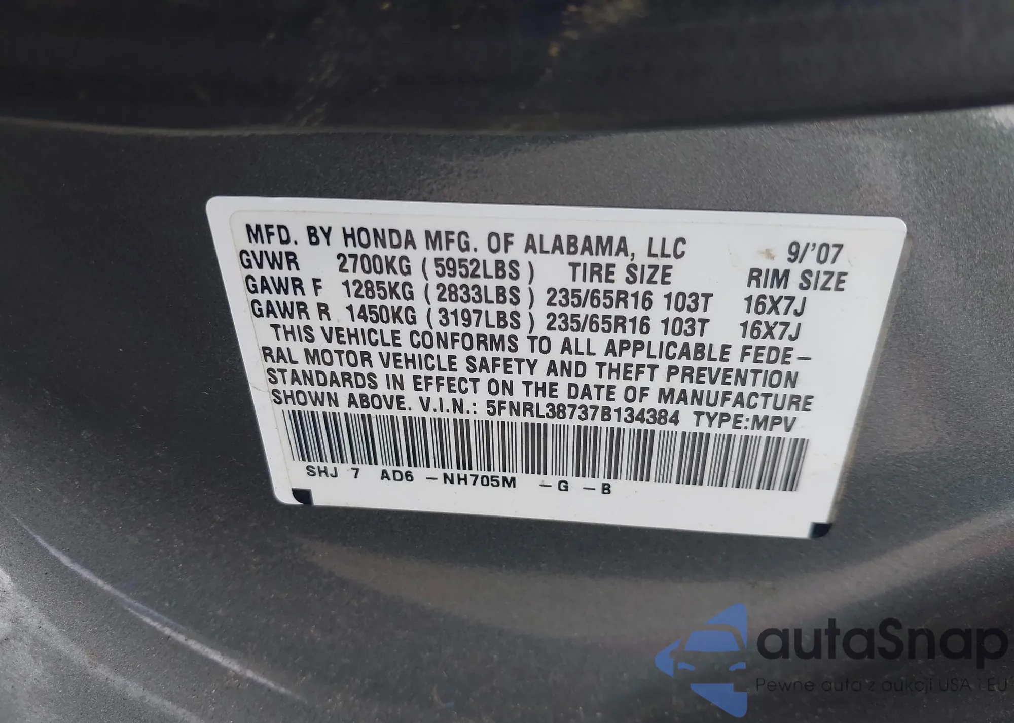 • VIN 5FNRL6H85NB058948