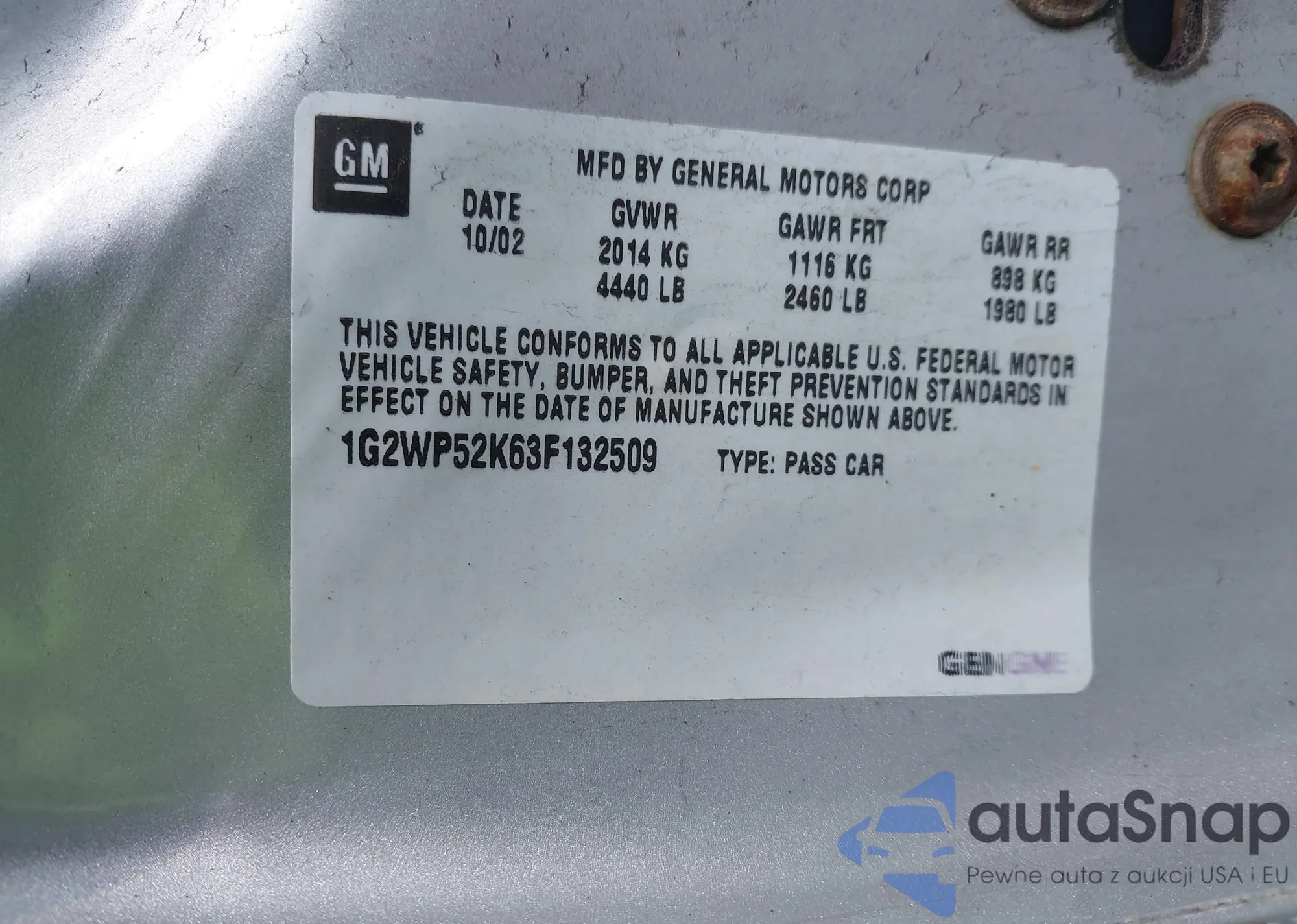 LOT: 42759620 VIN: 1G2WP52K63F132509