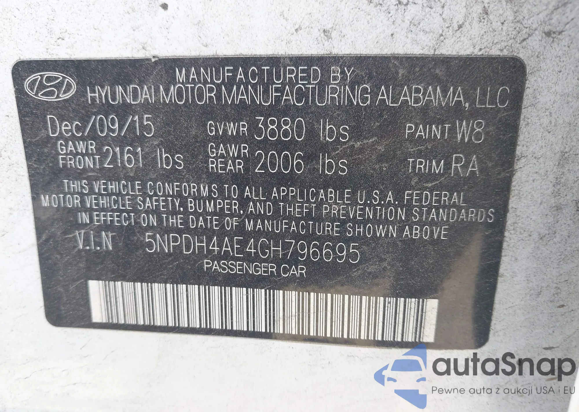 LOT: 42816603 VIN: 5NPDH4AE4GH796695