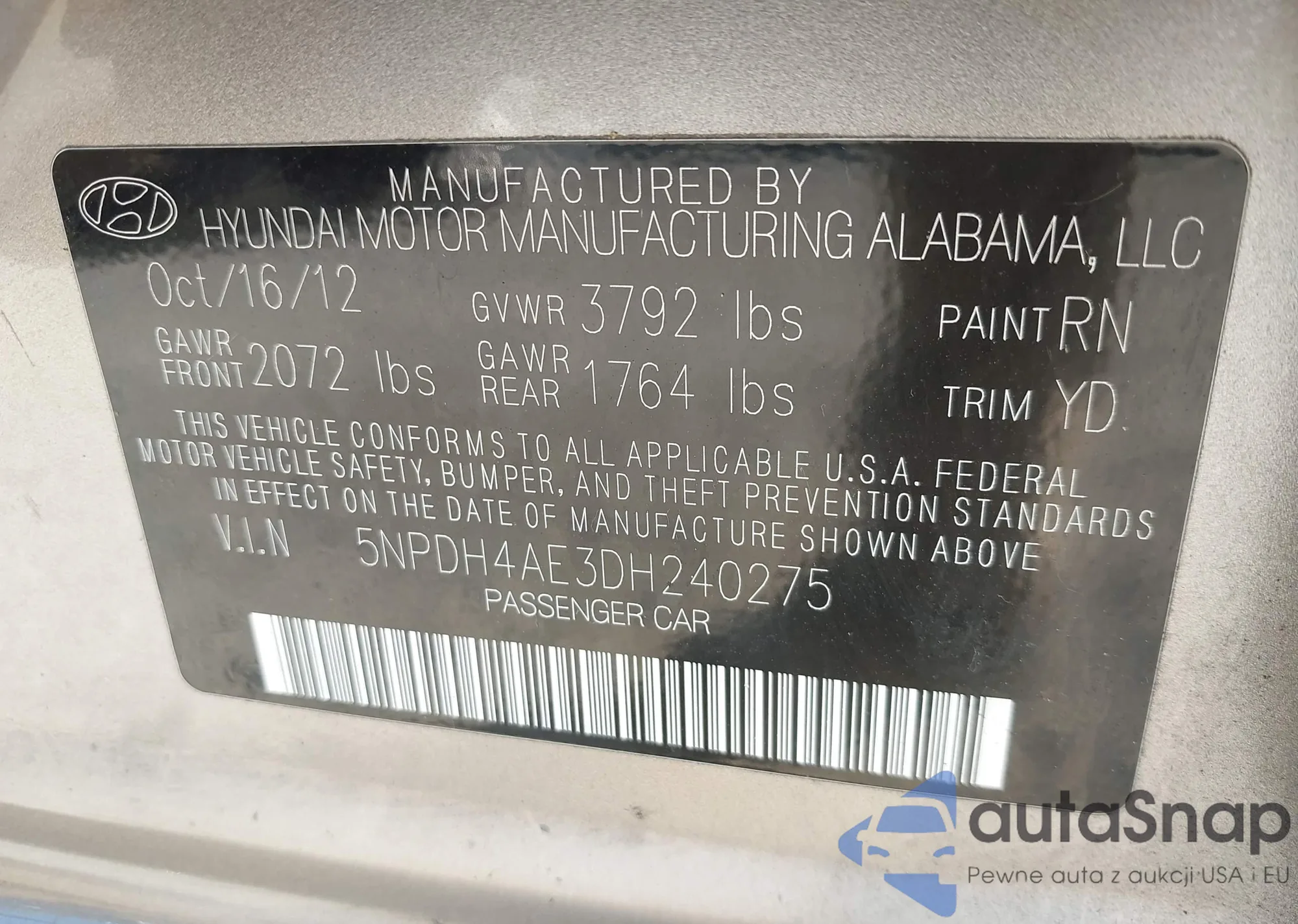 LOT: 42819323 VIN: 5NPDH4AE3DH240275