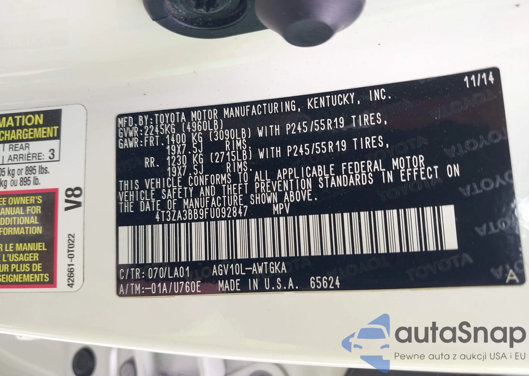 LOT: 42658113 VIN: 4T3ZA3BB9FU092847