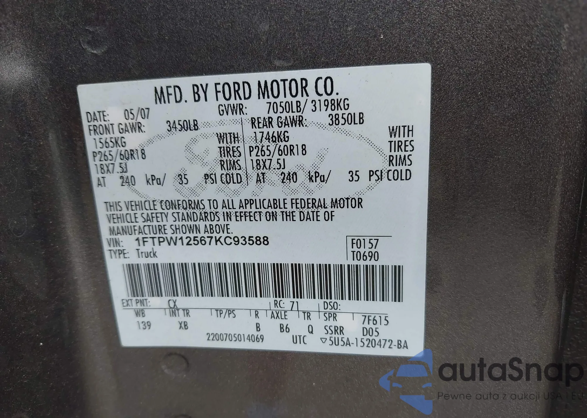 LOT: 42666104 VIN: 1FTPW12567KC93588