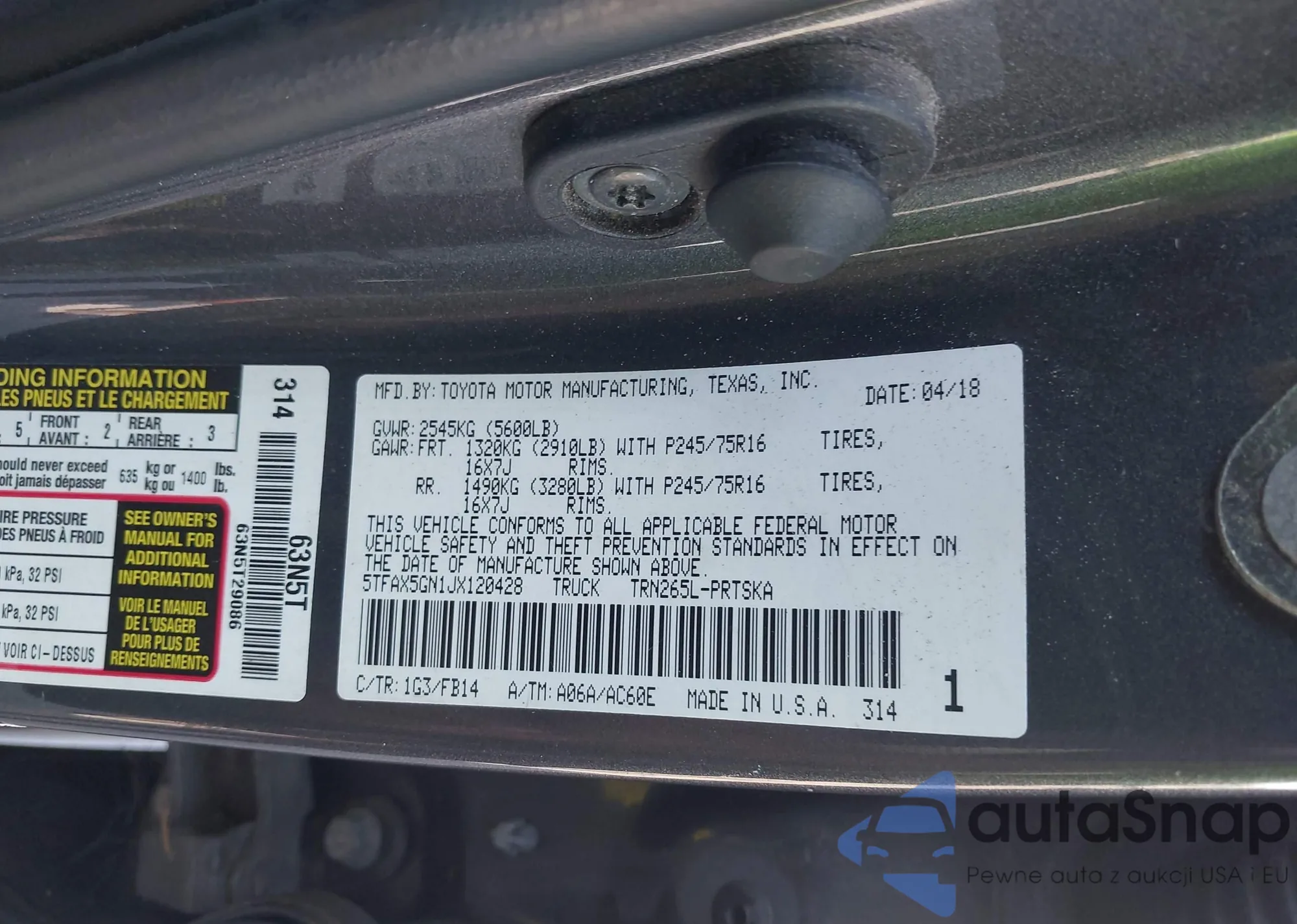 LOT: 42611841 VIN: 5TFAX5GN1JX120428