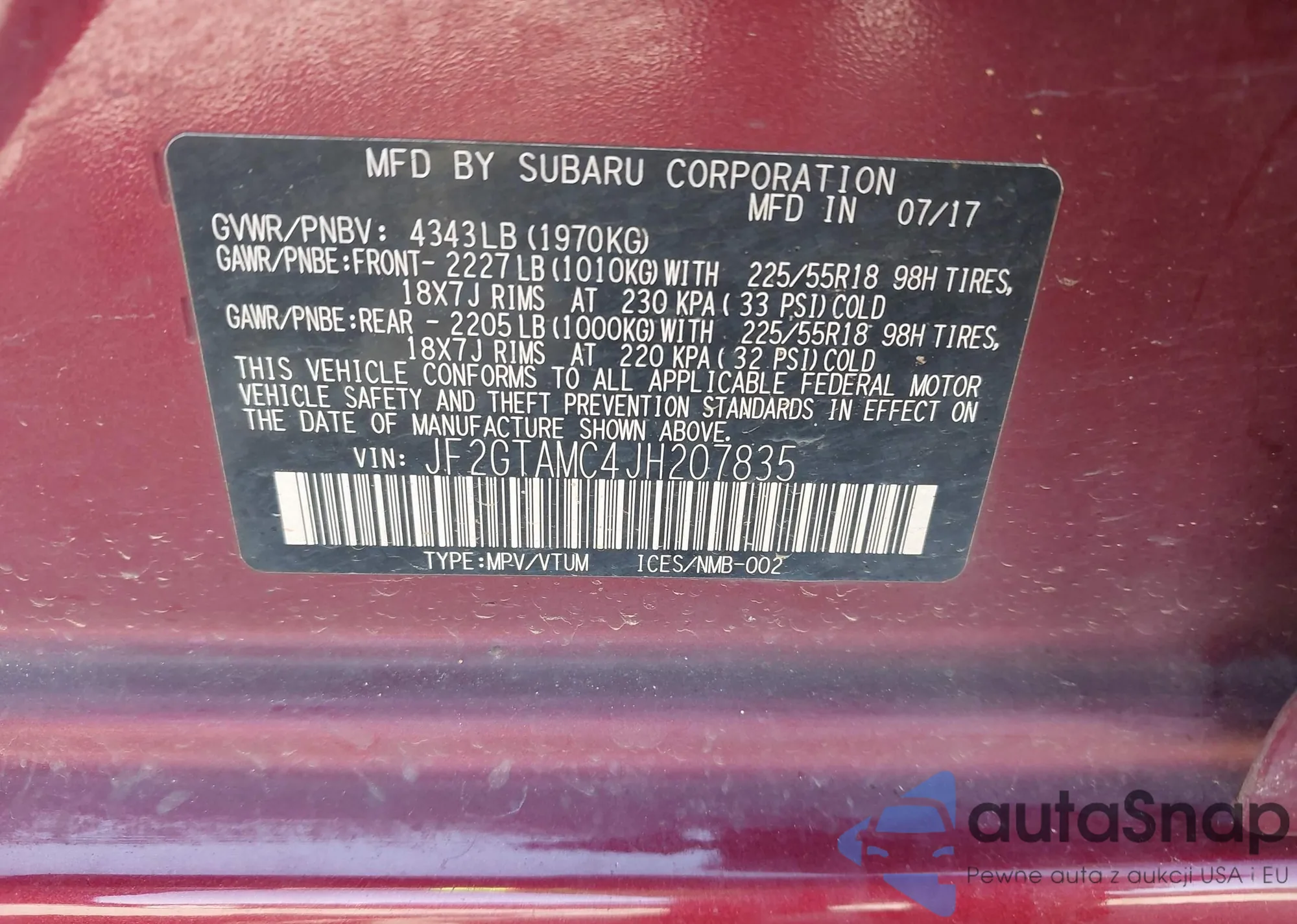 • VIN JF2GTAMC4JH207835