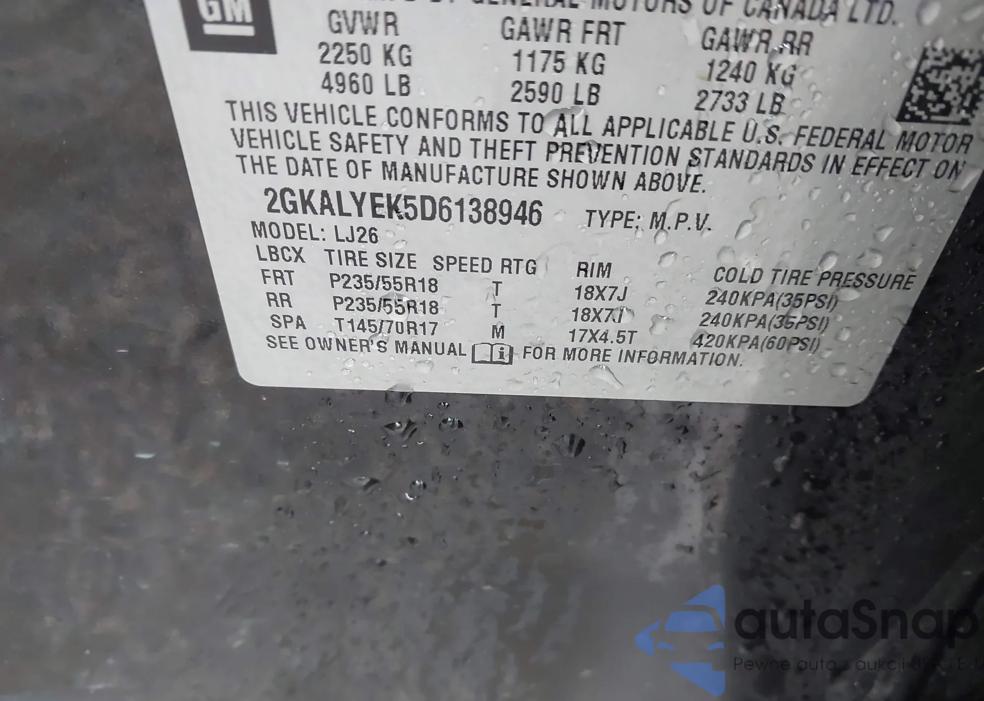 • VIN 2GKALYEK5D6138946