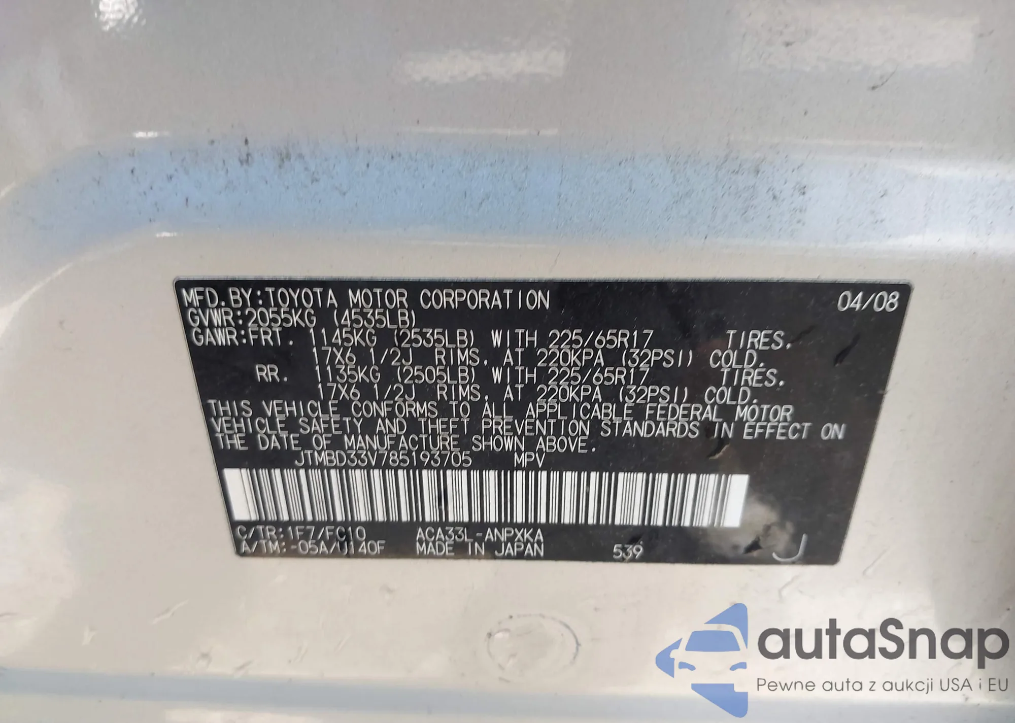 LOT: 42268466 VIN: JTMBD33V785193705