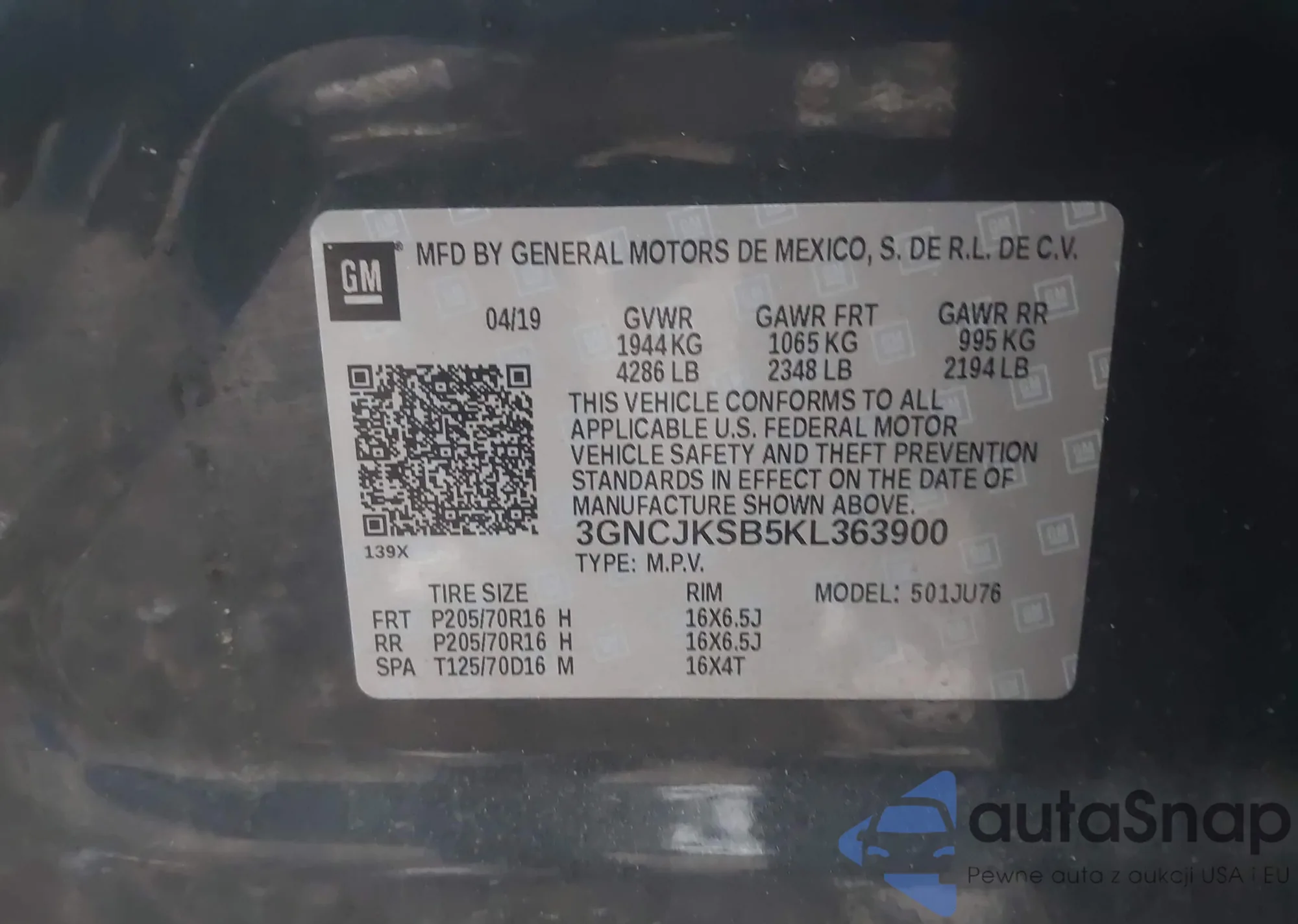 • VIN 3GNCJKSB5KL363900