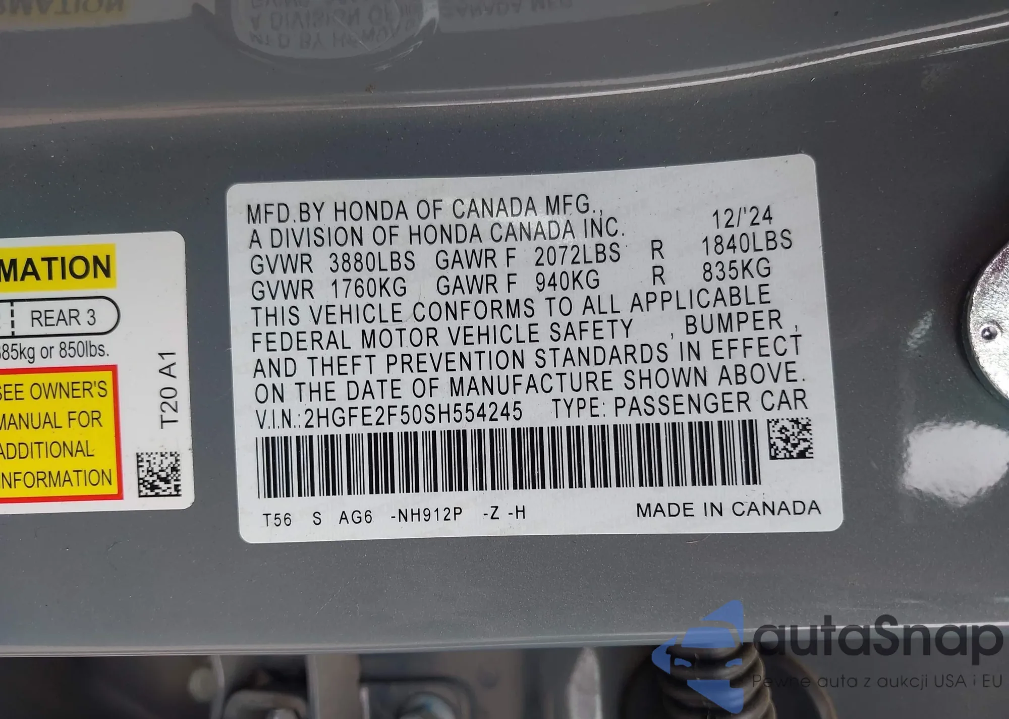 • VIN 2HGFE2F50SH554245