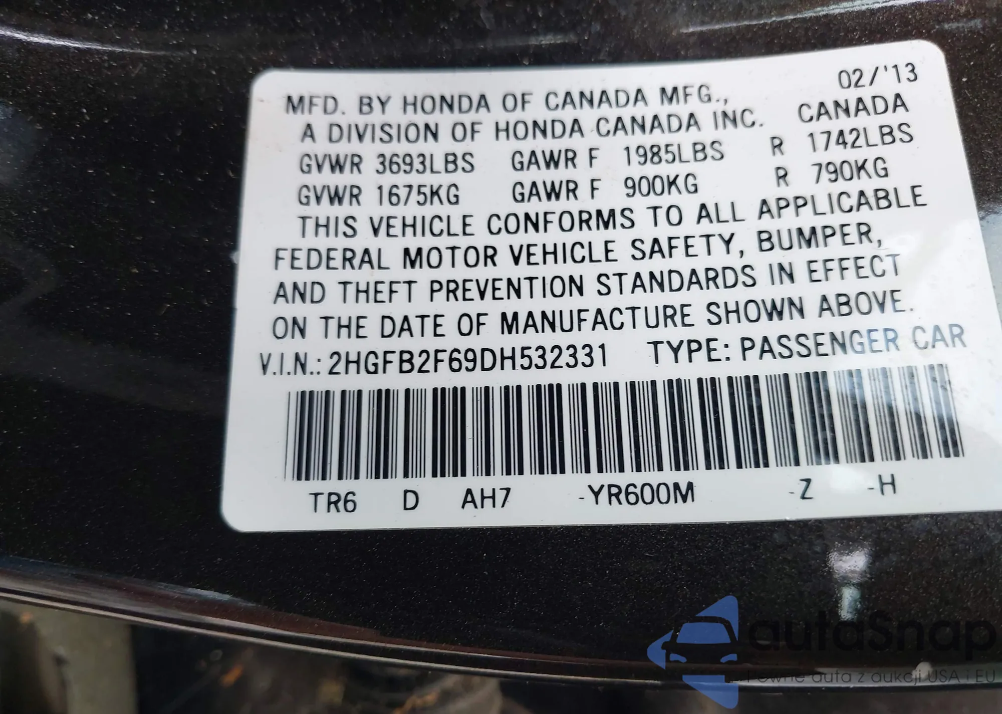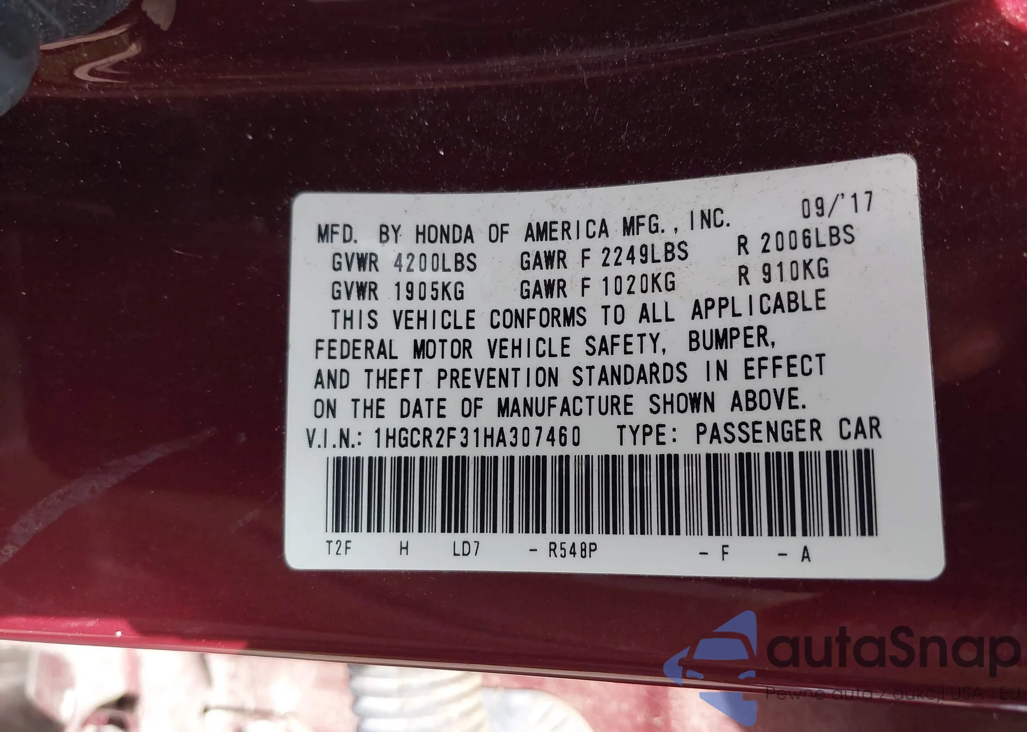LOT: 42038926 VIN: 1HGCR2F31HA307460