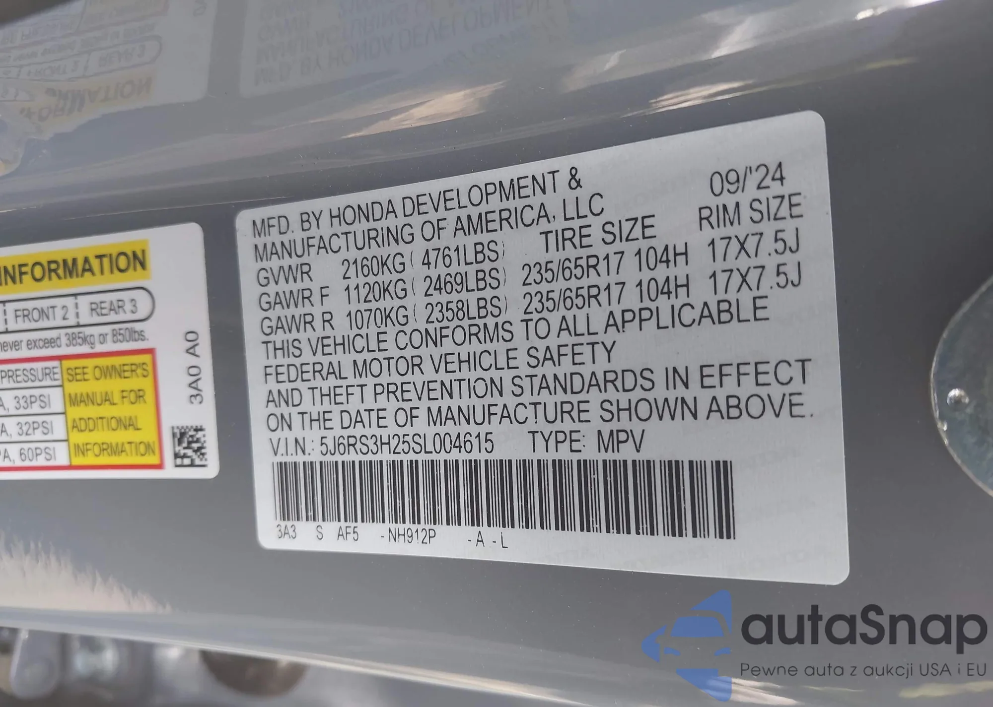 • VIN 5J6RS3H25SL004615