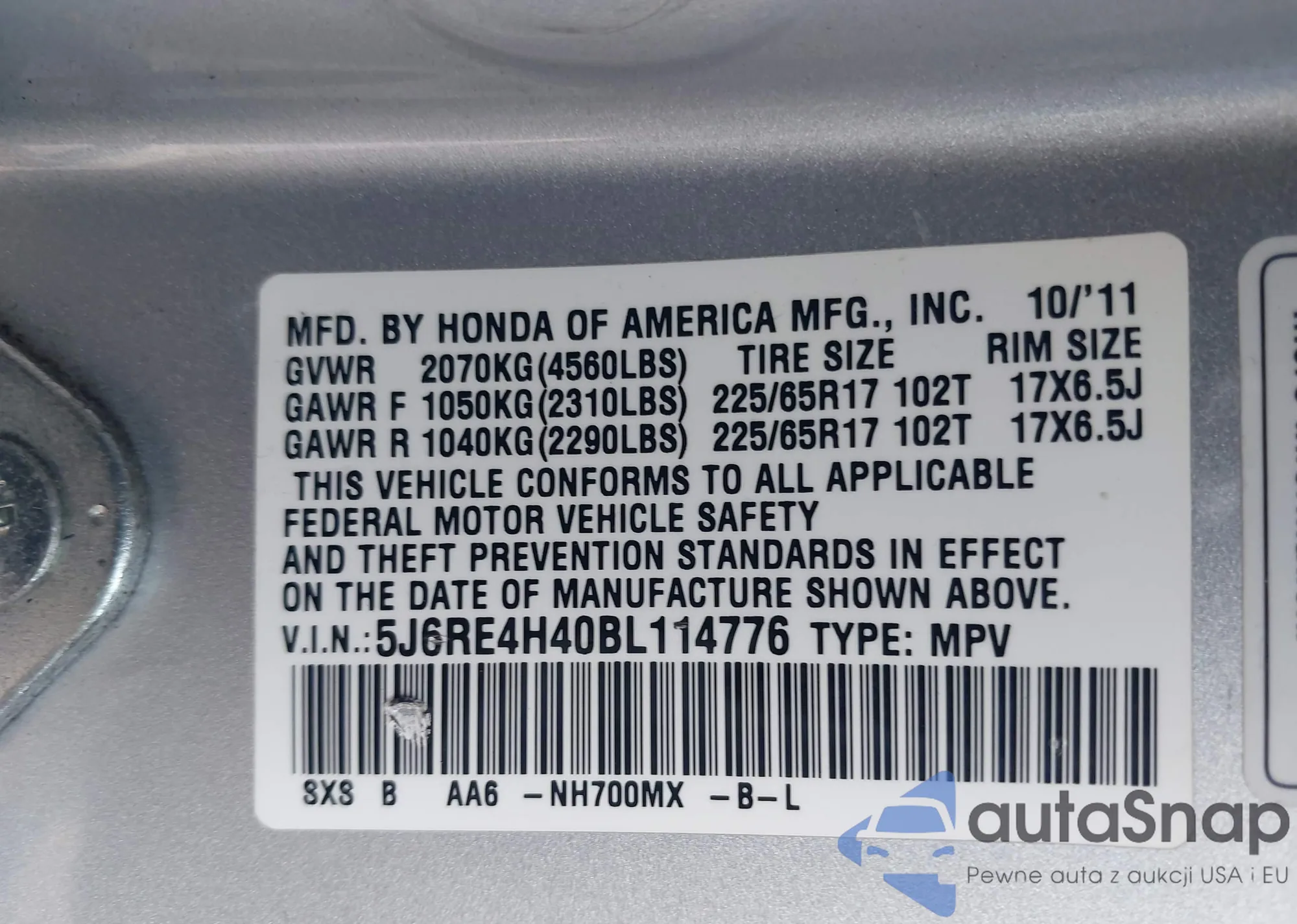 • VIN 5J6RE4H40BL114776