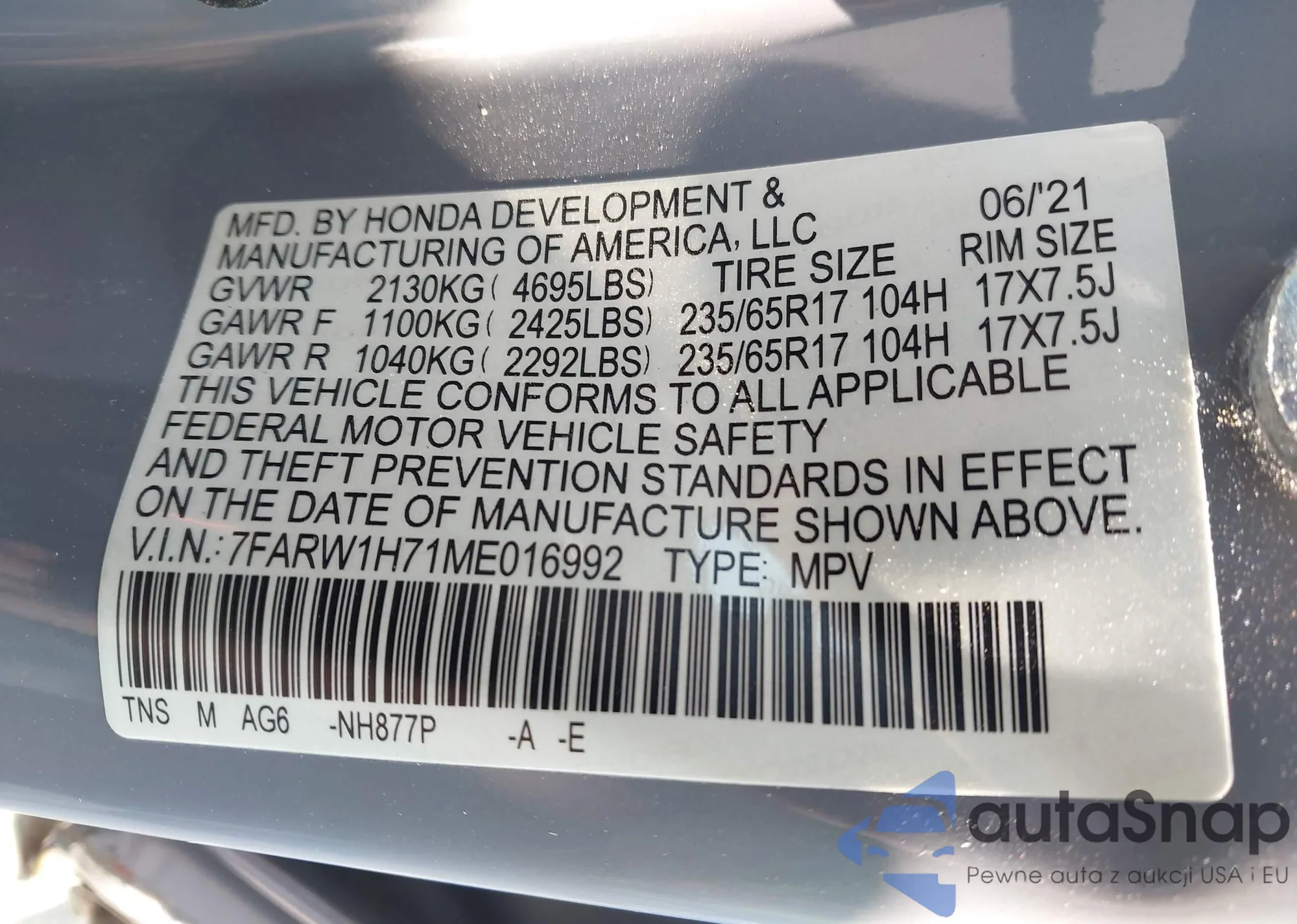 LOT: 42380634 VIN: 7FARW1H71ME016992