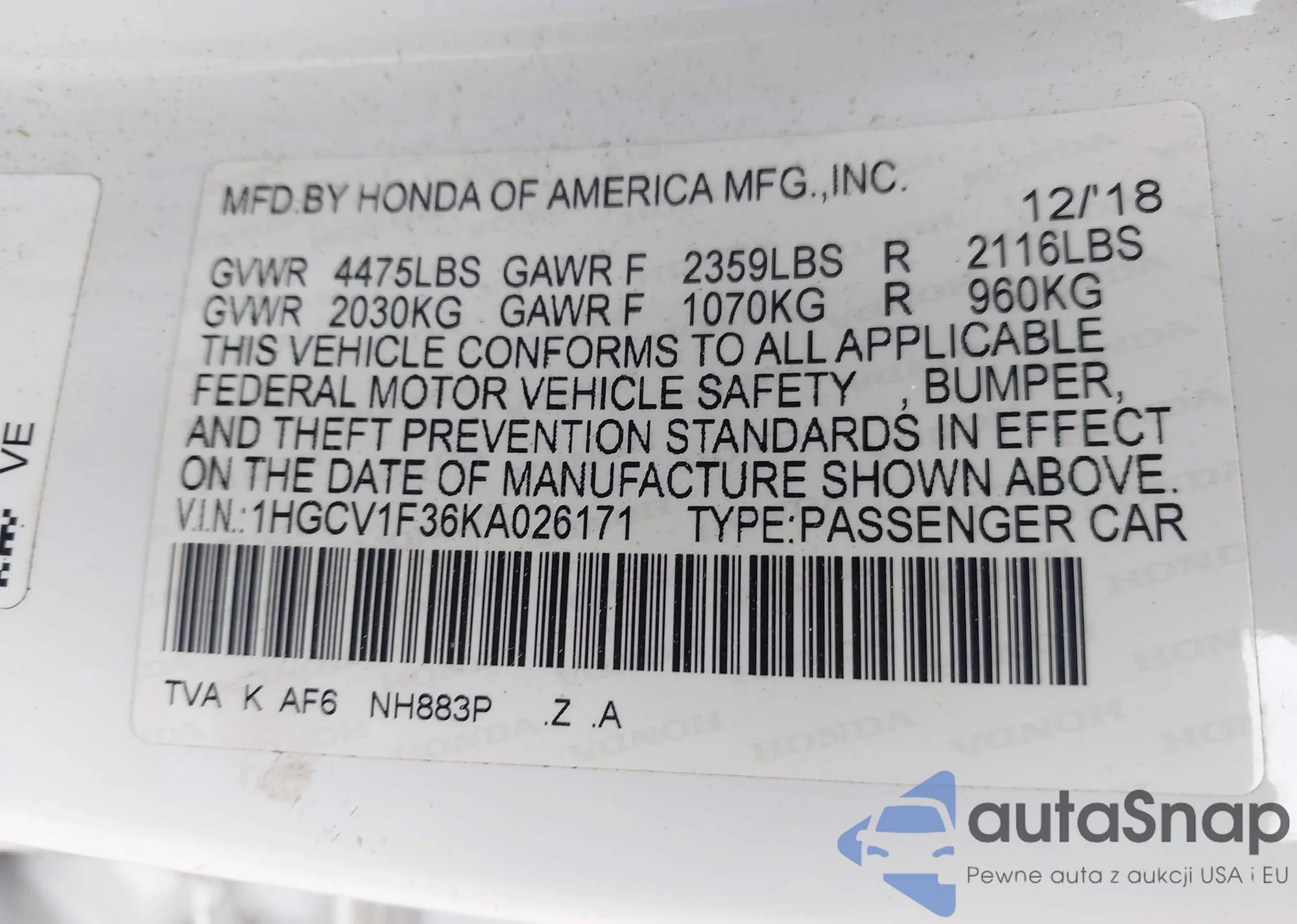 LOT: 42461323 VIN: 1HGCV1F36KA026171