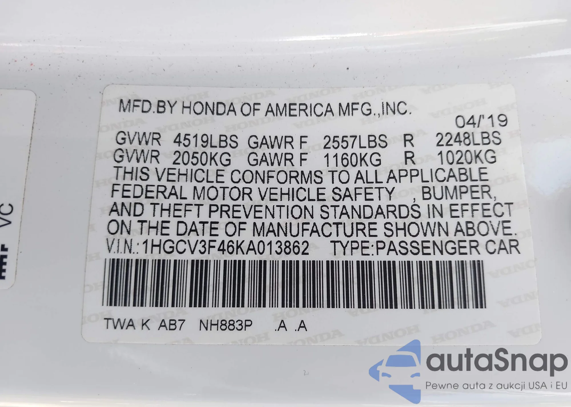 LOT: 42621906 VIN: 1HGCV3F46KA013862