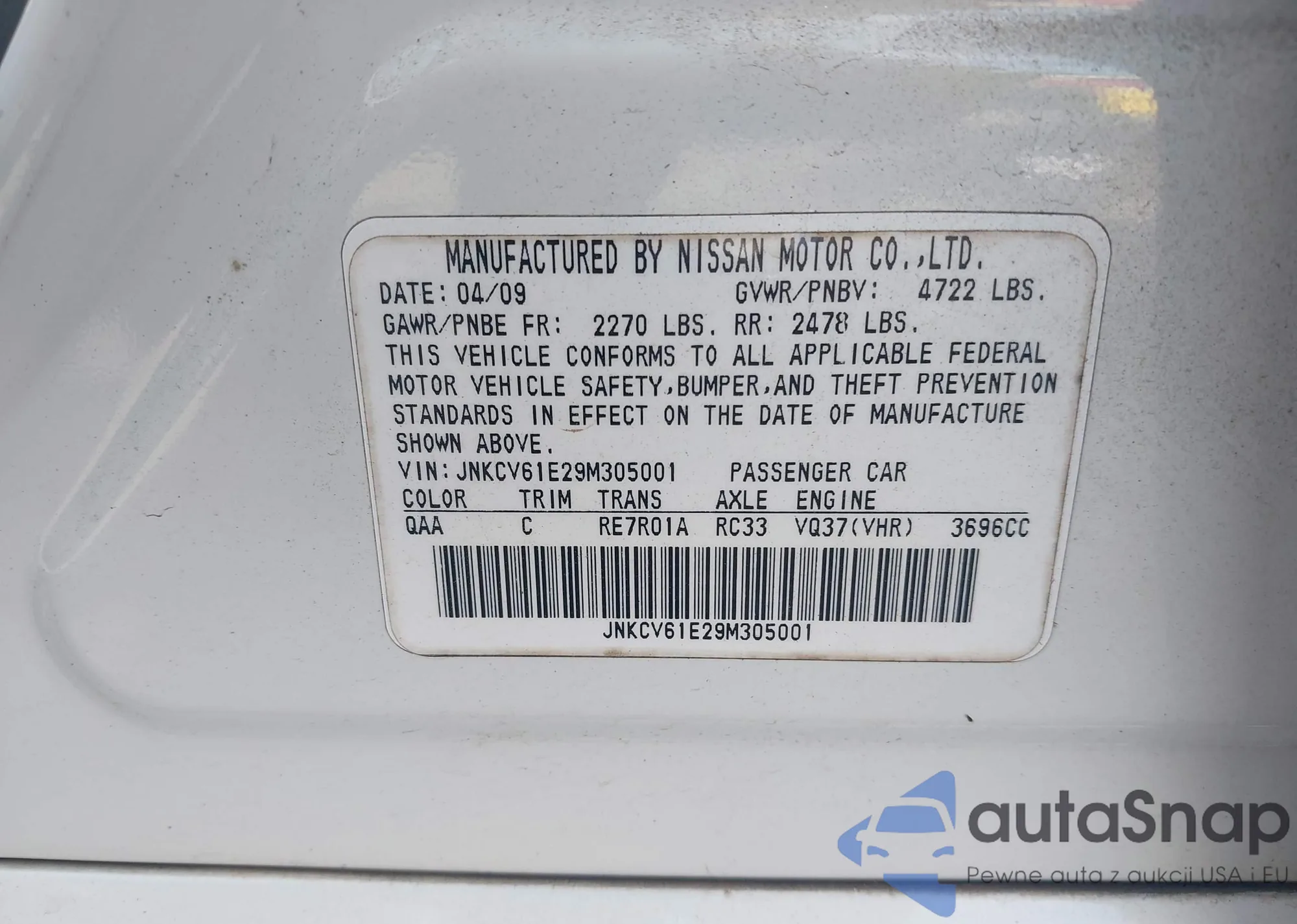 LOT: 42629311 VIN: JNKCV61E29M305001