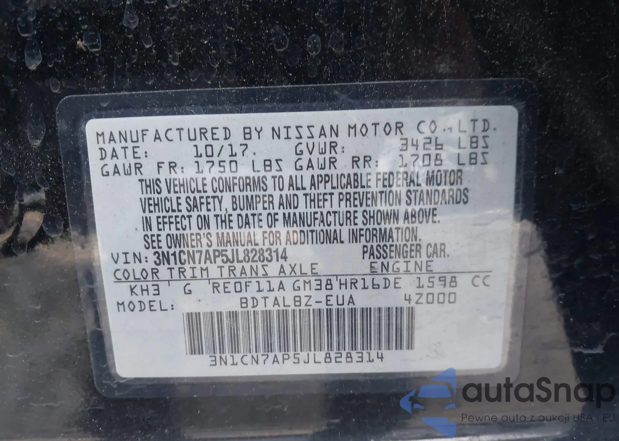 LOT: 42401521 VIN: 3N1CN7AP5JL828314