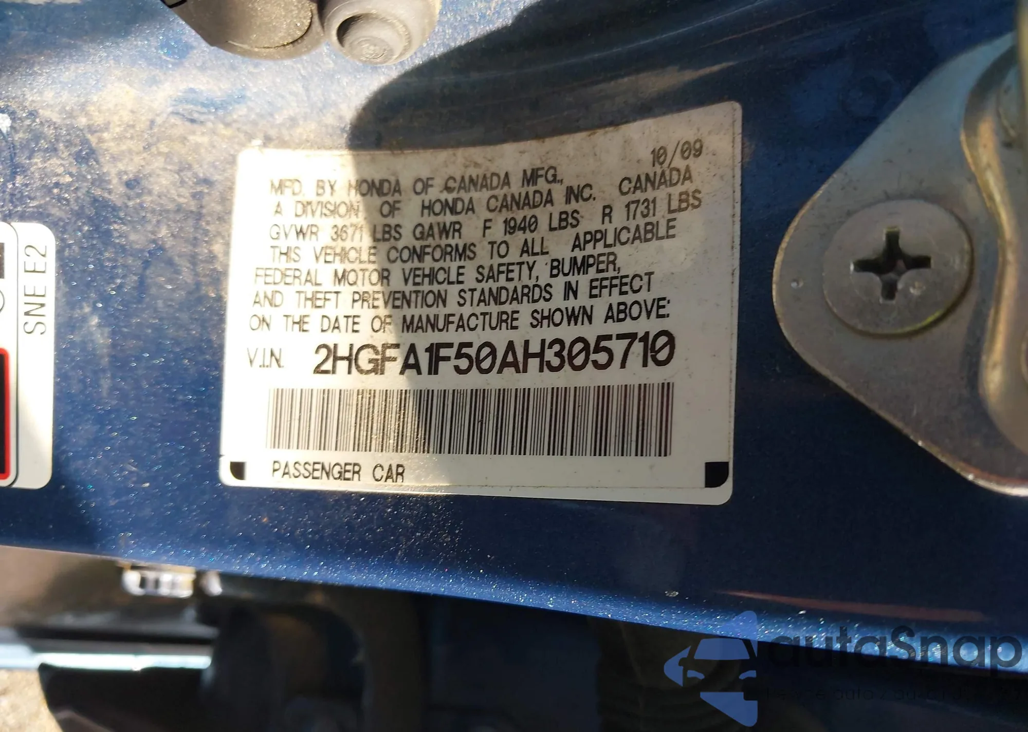 • VIN 2HGFA1F50AH305710