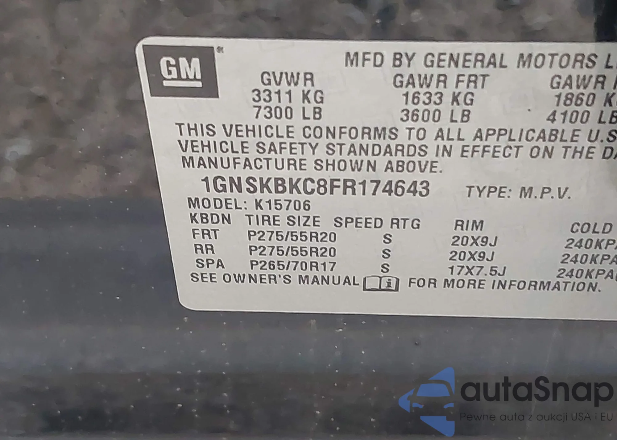 LOT: 42423838 VIN: 1GNSKBKC8FR174643