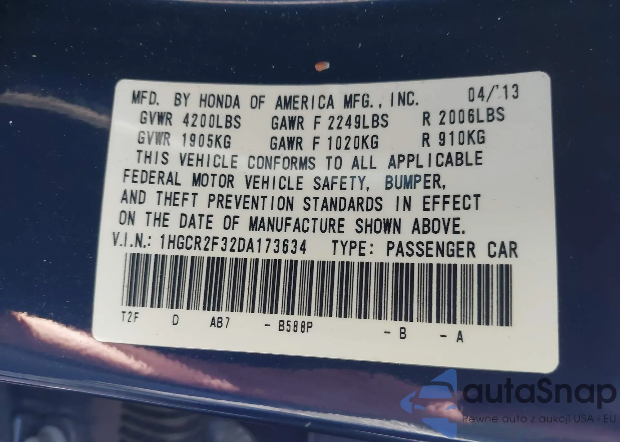 LOT: 41777600 VIN: 1HGCR2F32DA173634