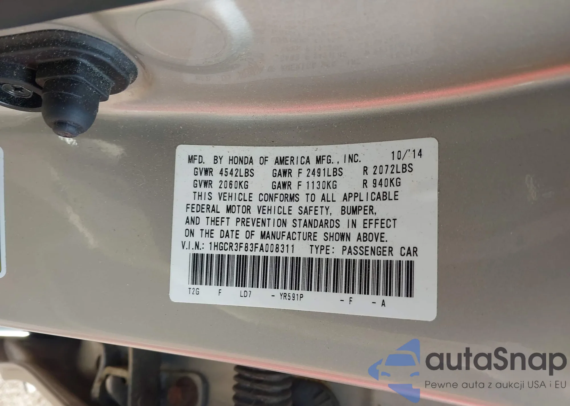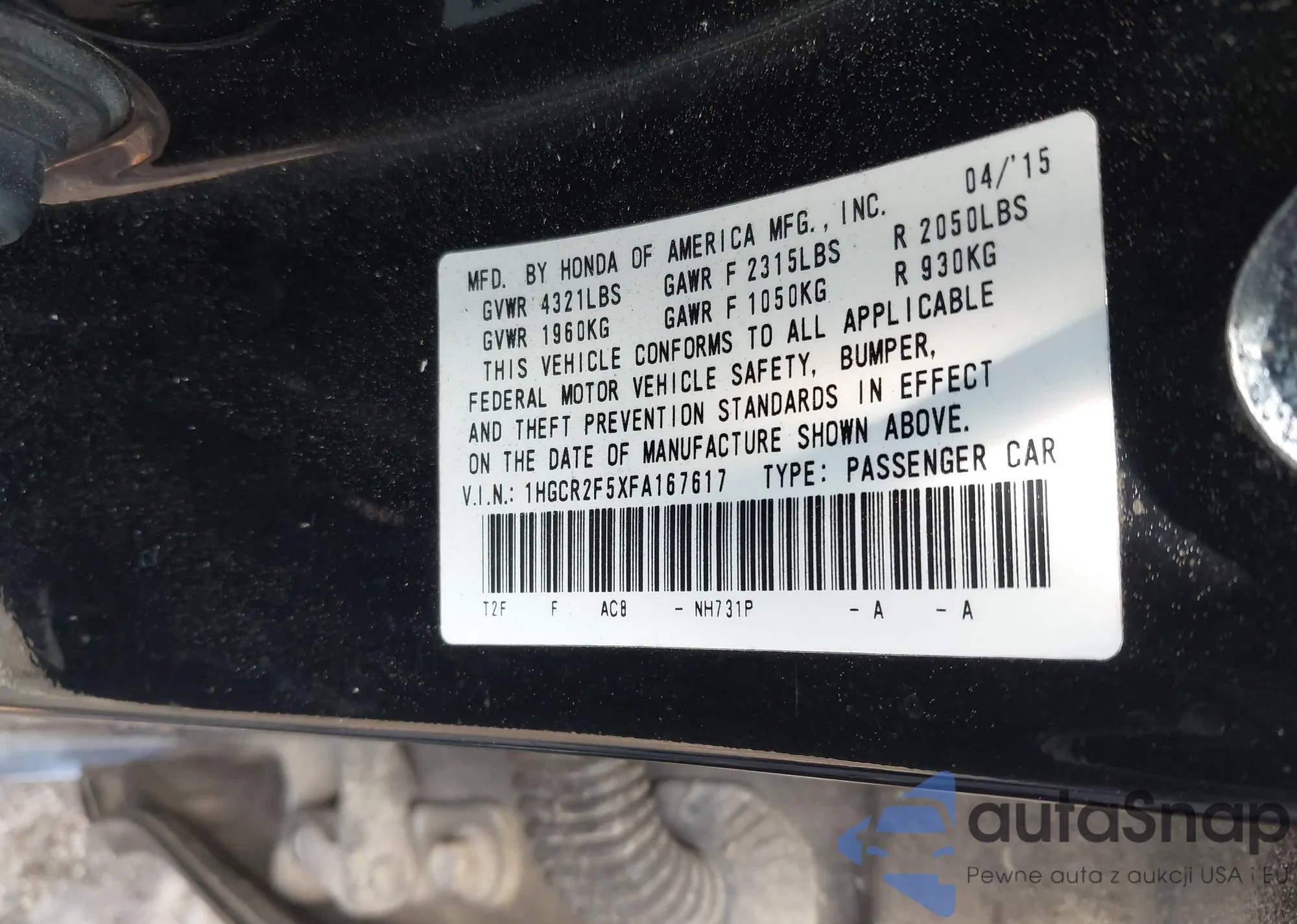 LOT: 42248641 VIN: 1HGCR2F5XFA167617