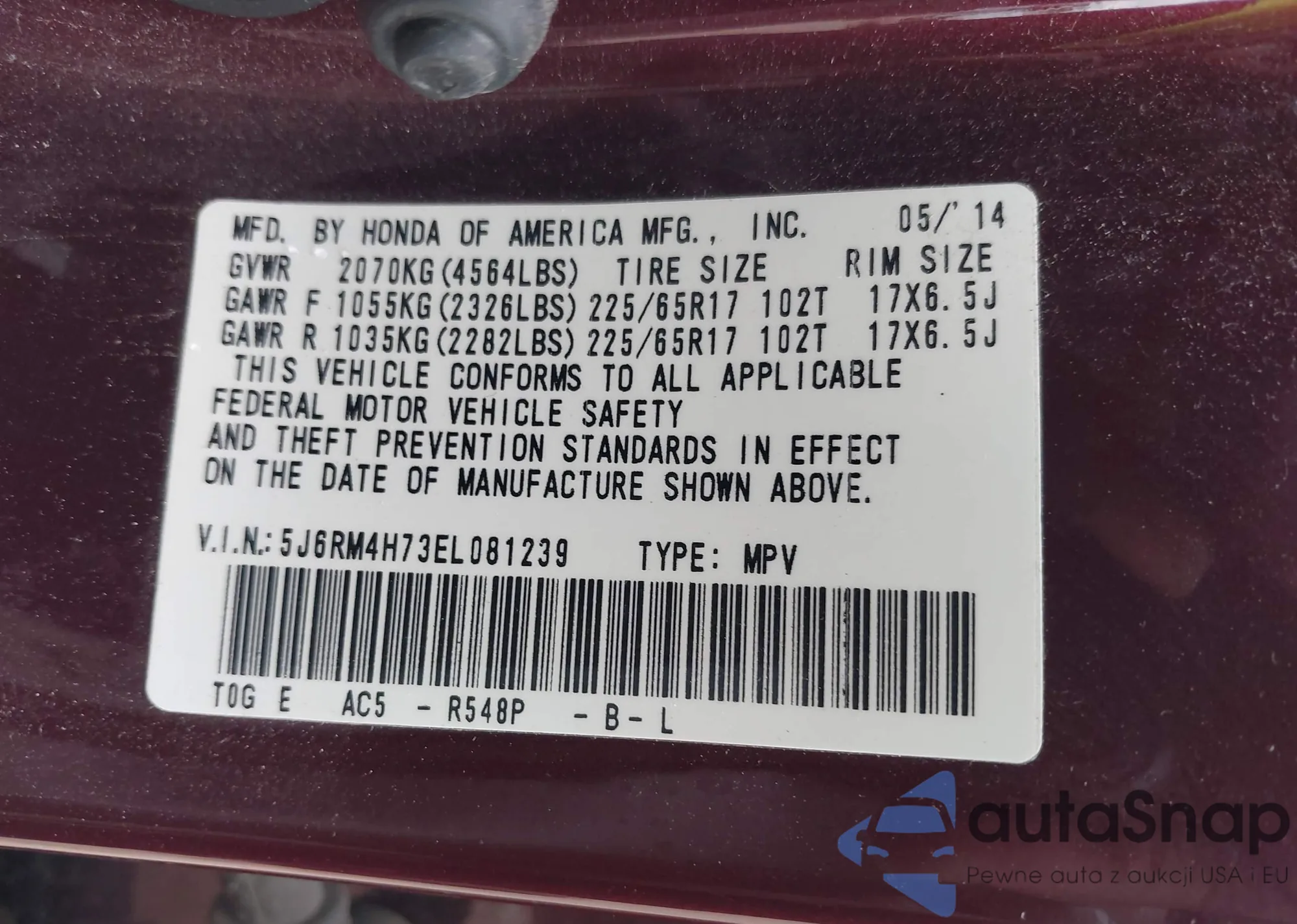• VIN 5J6RM4H73EL081239