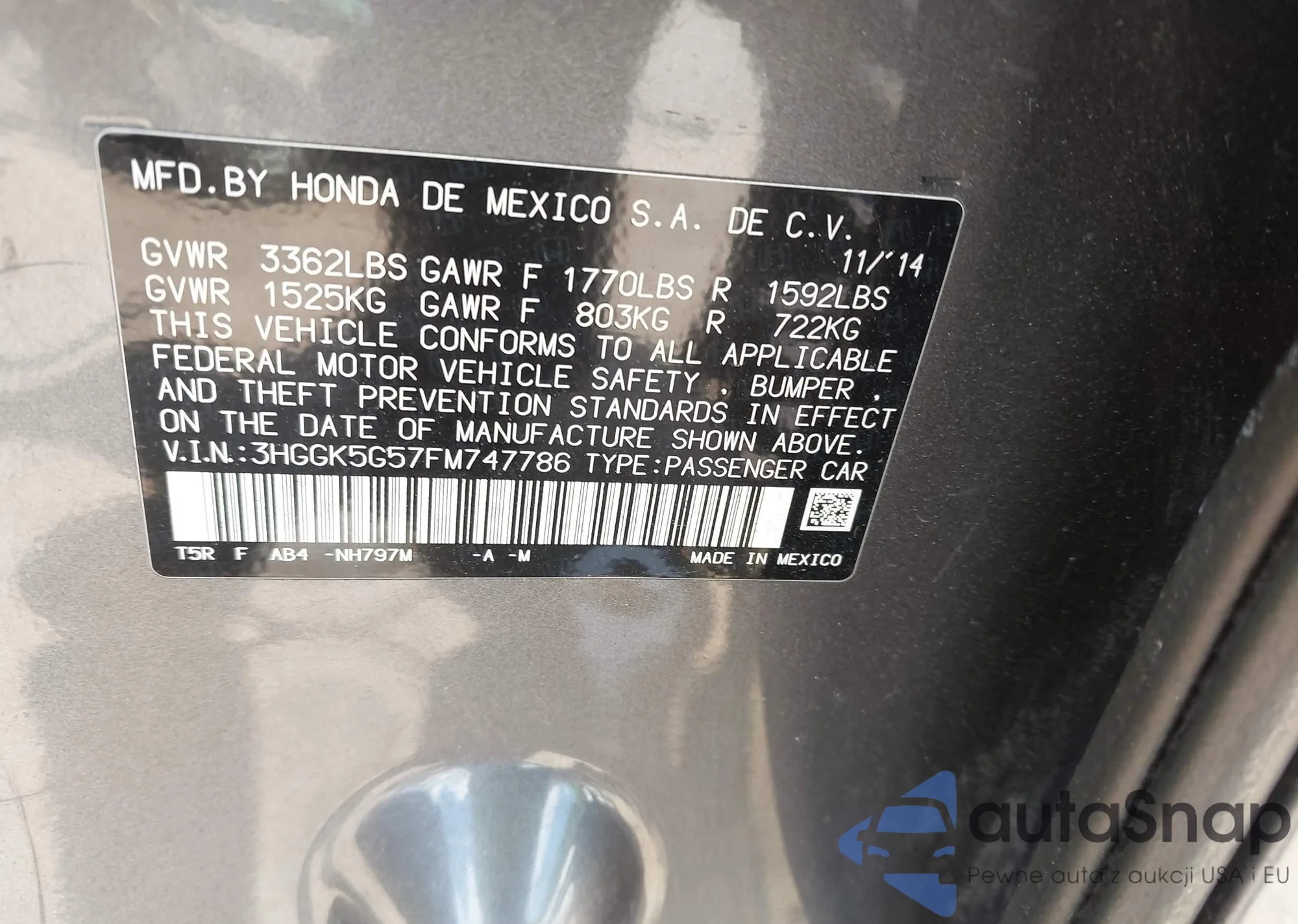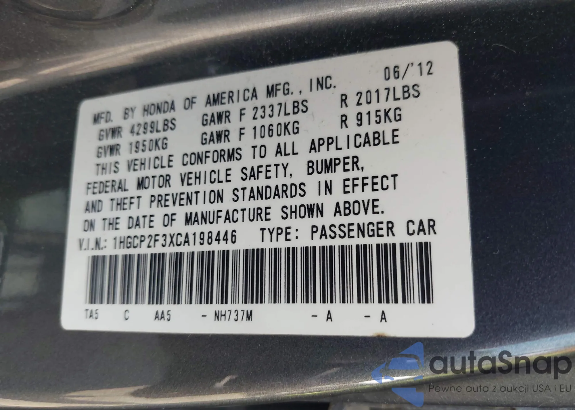 LOT: 42707046 VIN: 1HGCP2F3XCA198446