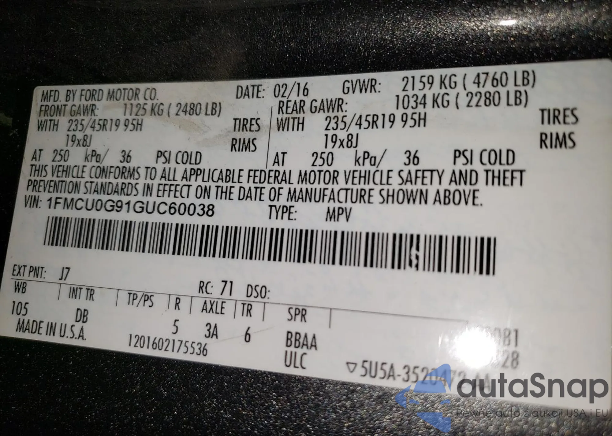 LOT: 66029995 VIN: 1FMCU0G79GUA64508