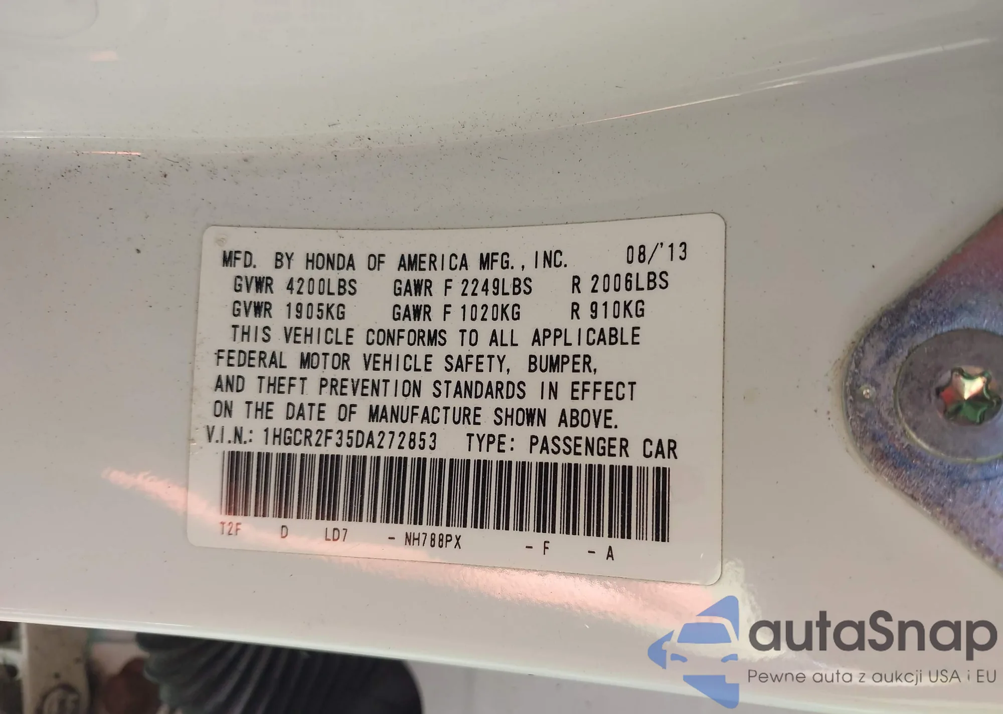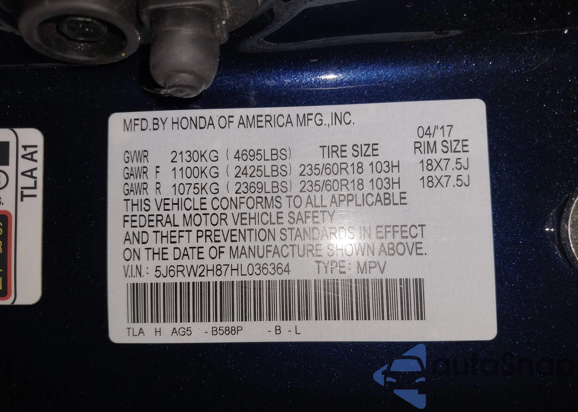 • VIN 5J6RW2H87HL036364