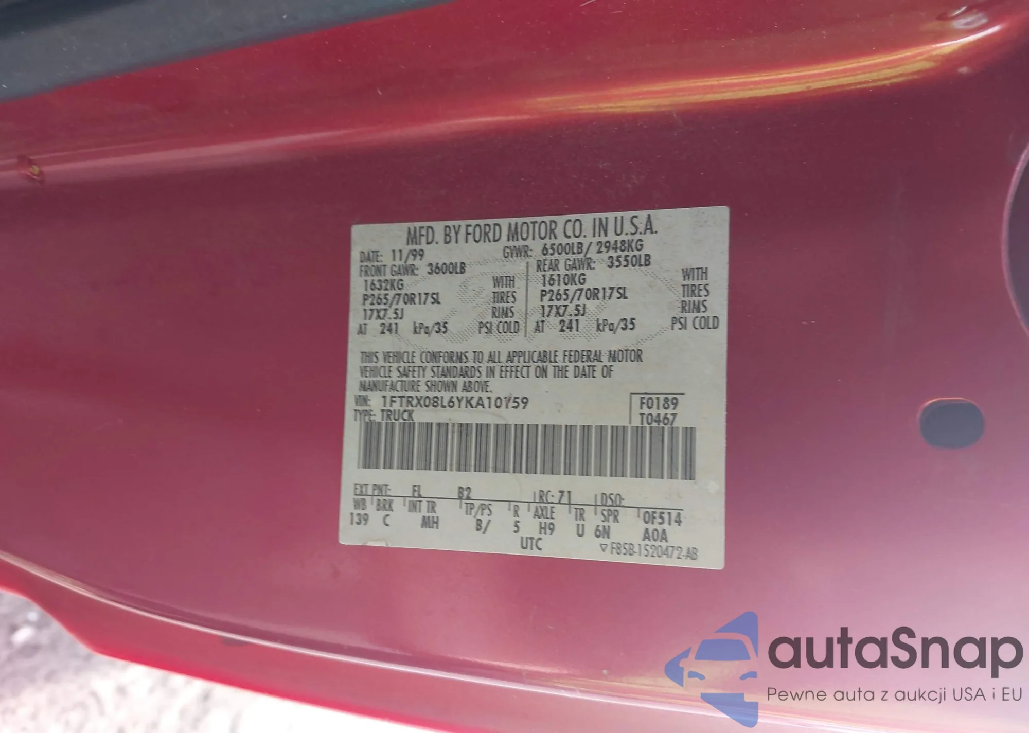 • VIN 1FTRX08L6YKA10159