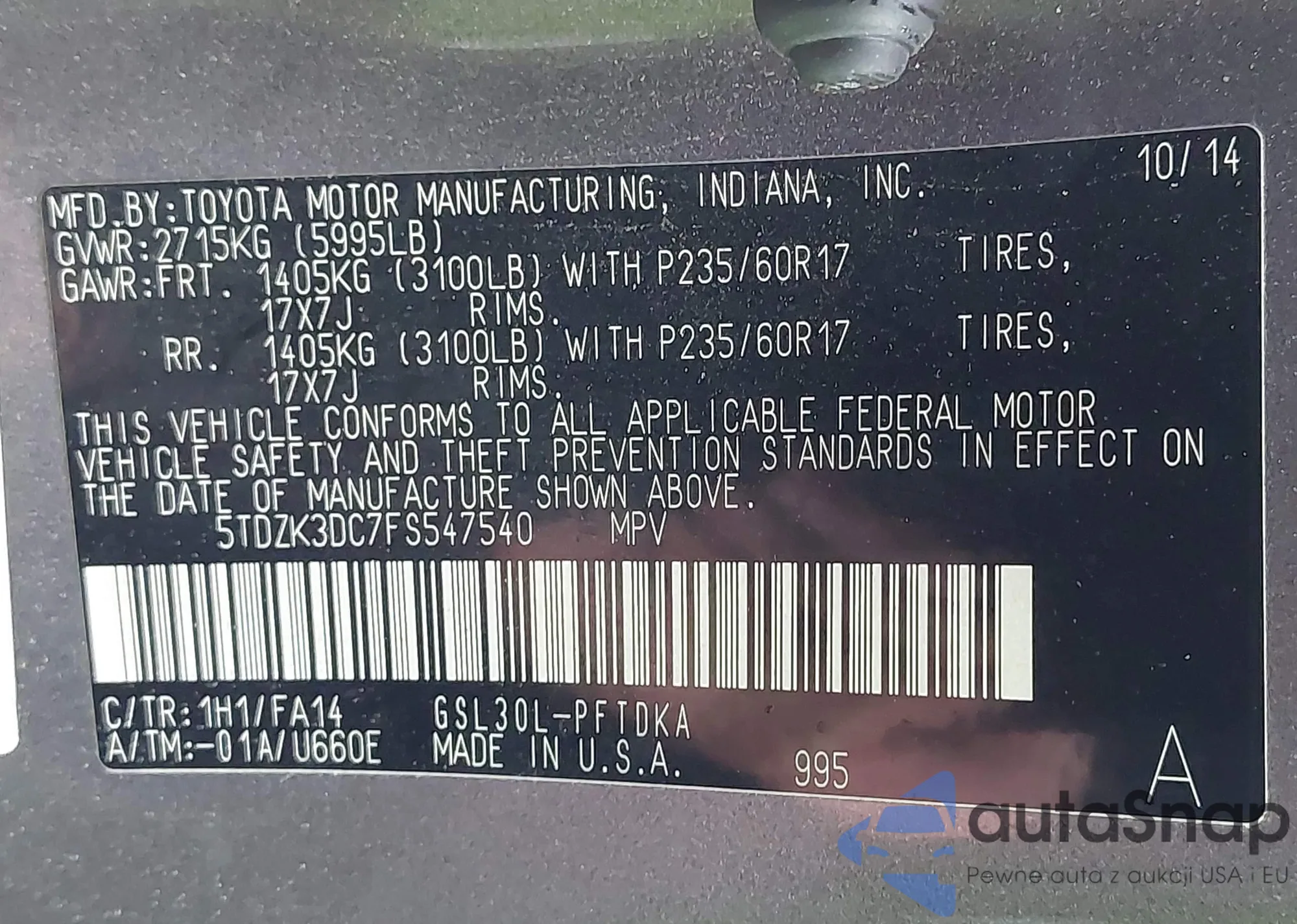 • VIN 5TDZK3DC7FS547540
