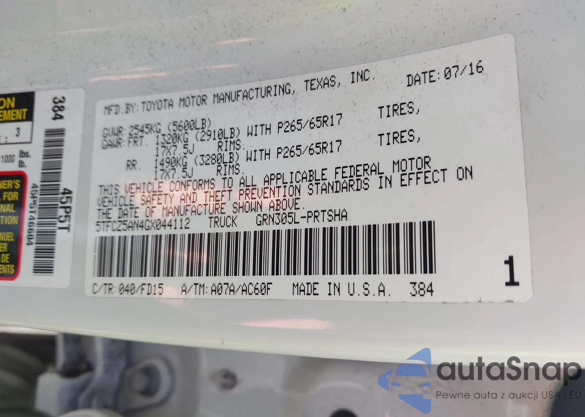 LOT: 42537372 VIN: 5TFCZ5AN4GX044112
