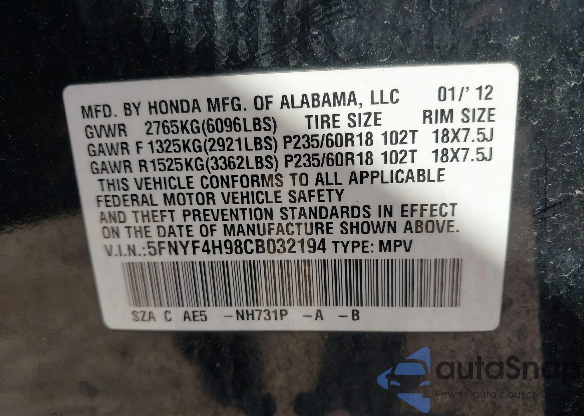 LOT: 42409141 VIN: 5FNYF4H98CB032194
