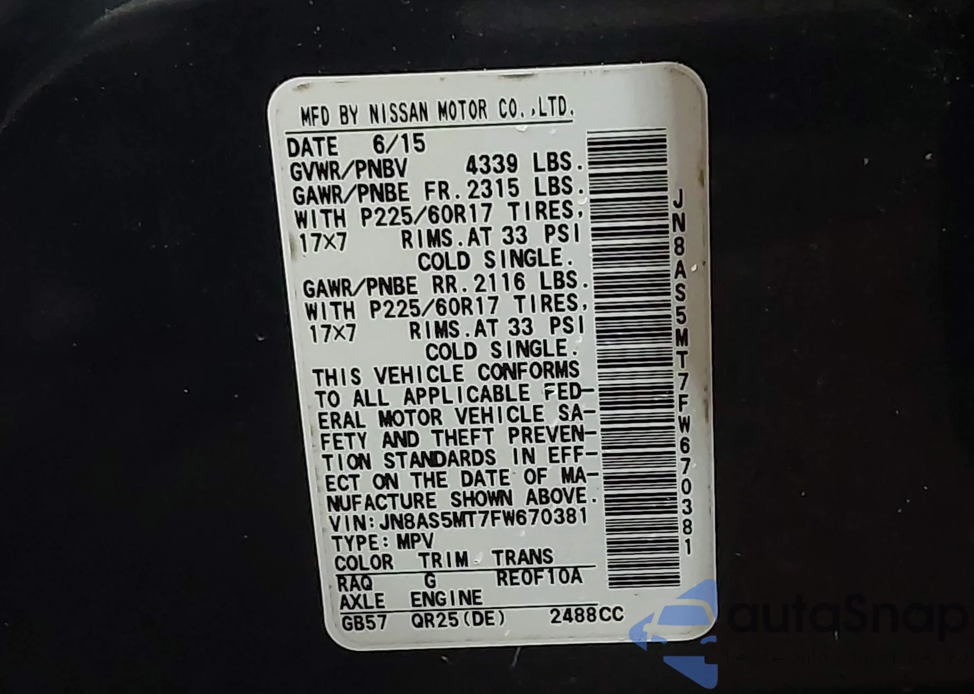 • VIN JN8AS5MT7FW670381