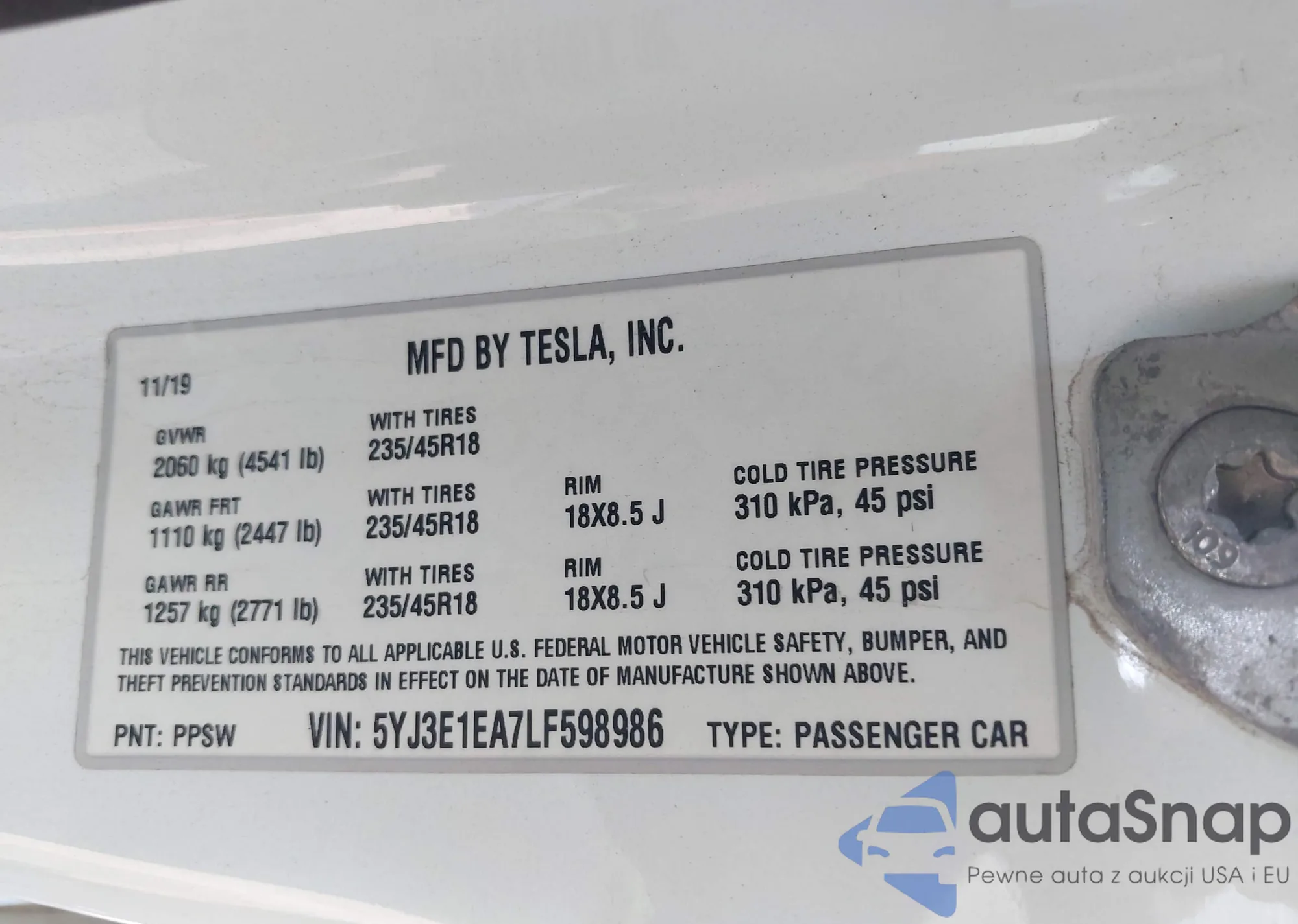 • VIN 5YJ3E1EA7LF598986