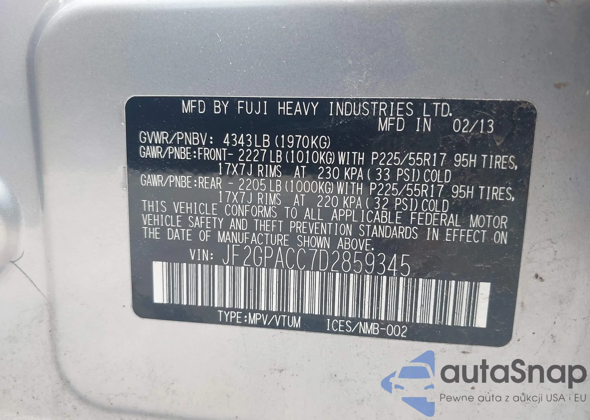 LOT: 42696039 VIN: JF2GPACC7D2859345