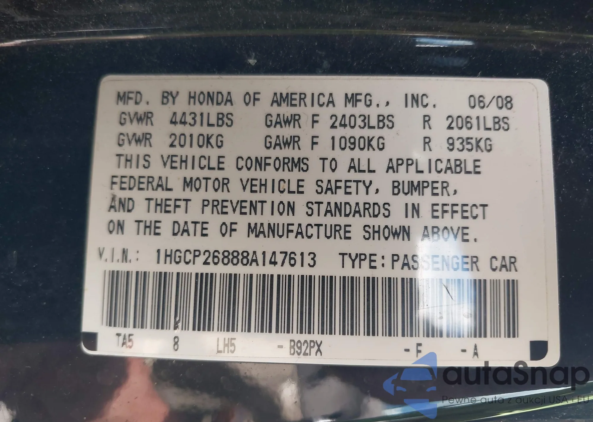 • VIN 1HGCP26888A147613