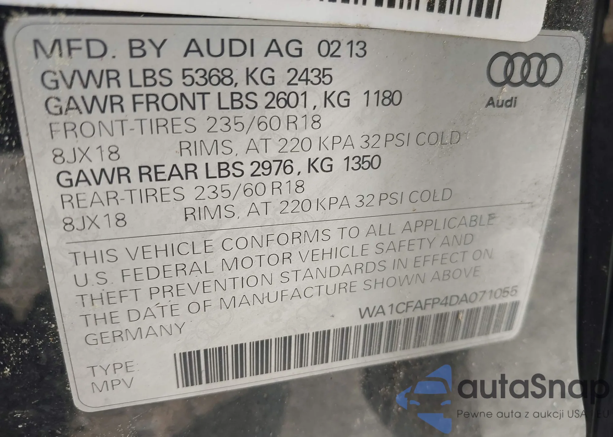 LOT: 42807576 VIN: WA1CFAFP4DA071055