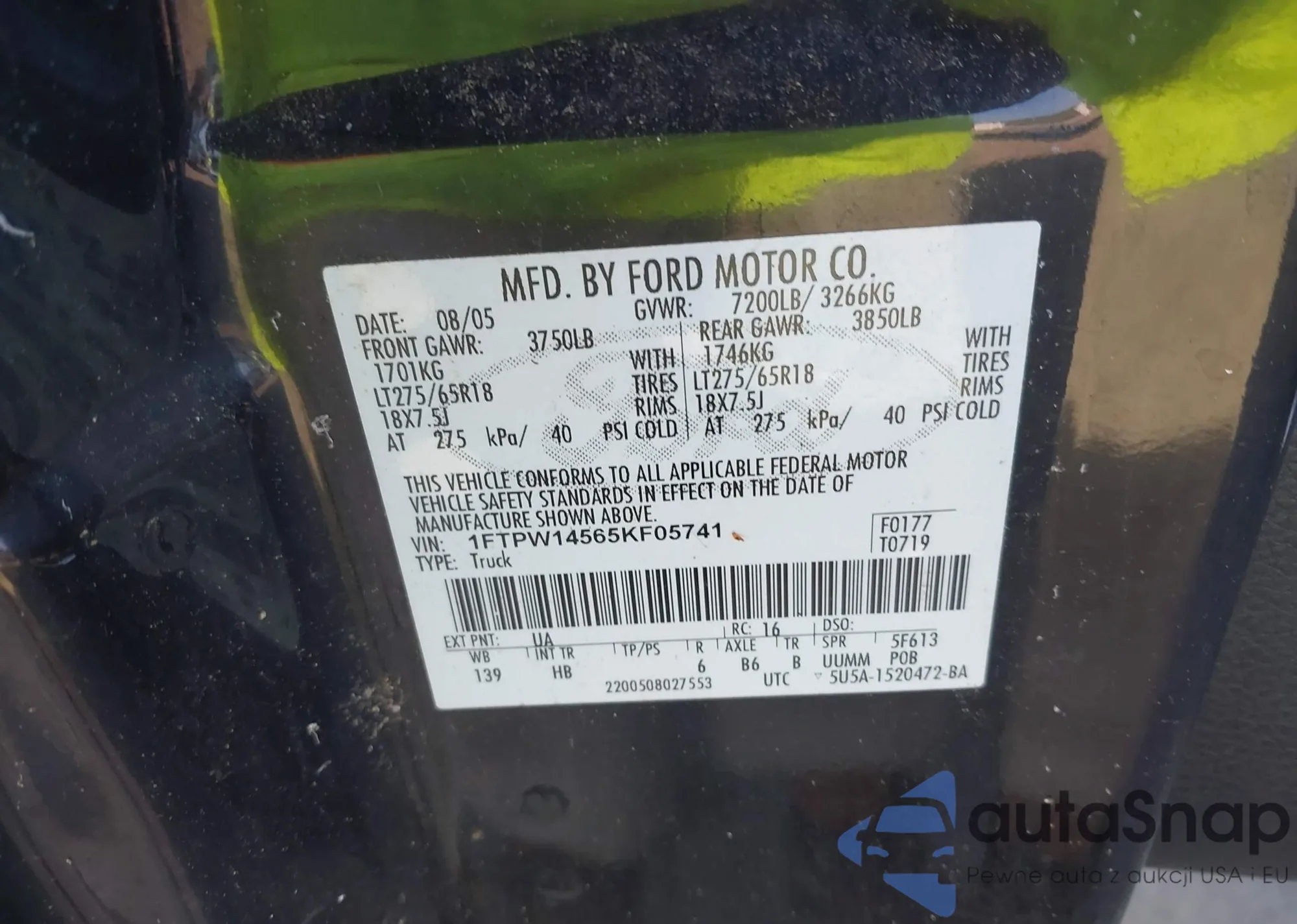LOT: 42831697 VIN: 1FTPW14565KF05741