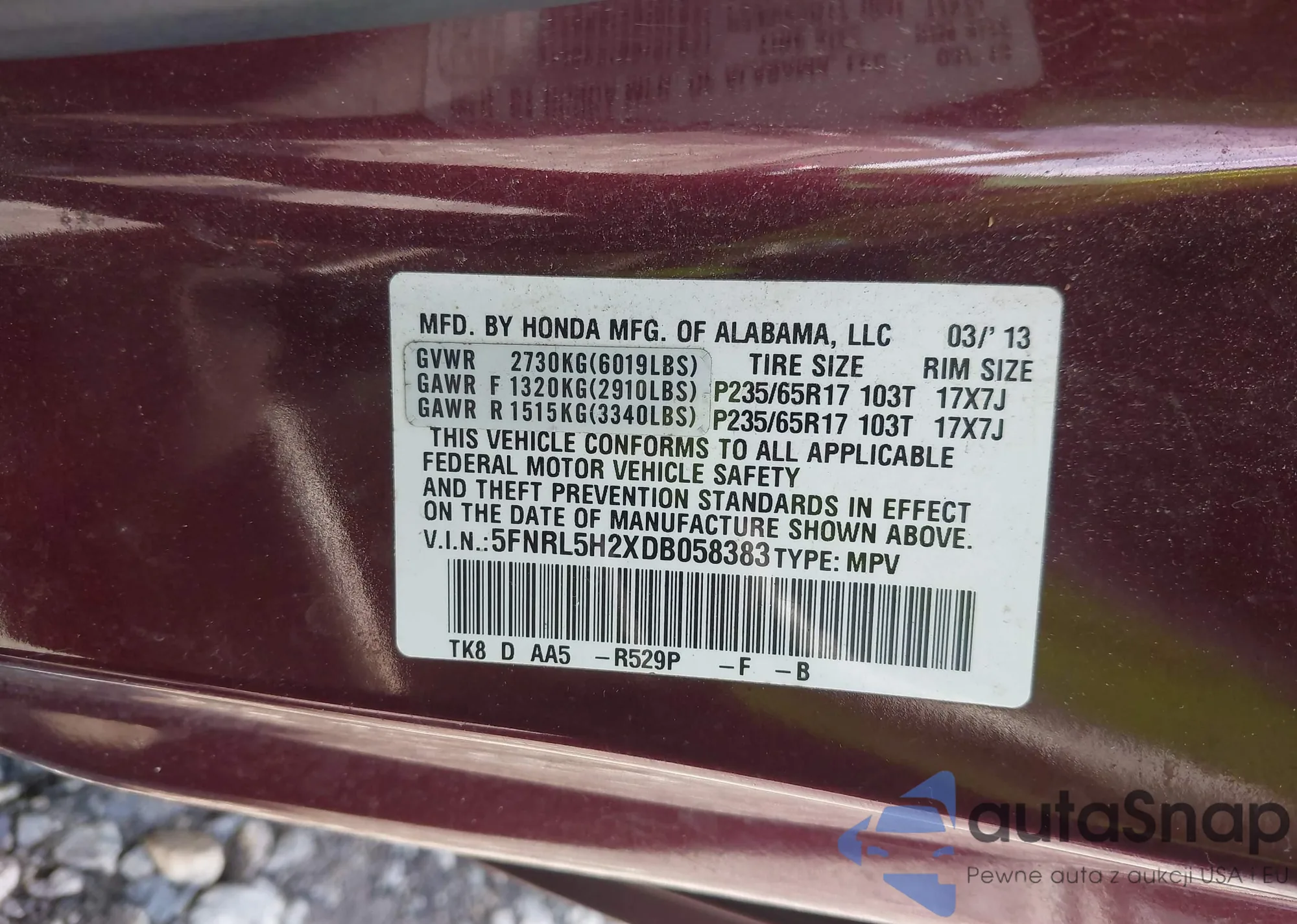 • VIN 5FNRL5H2XDB058383