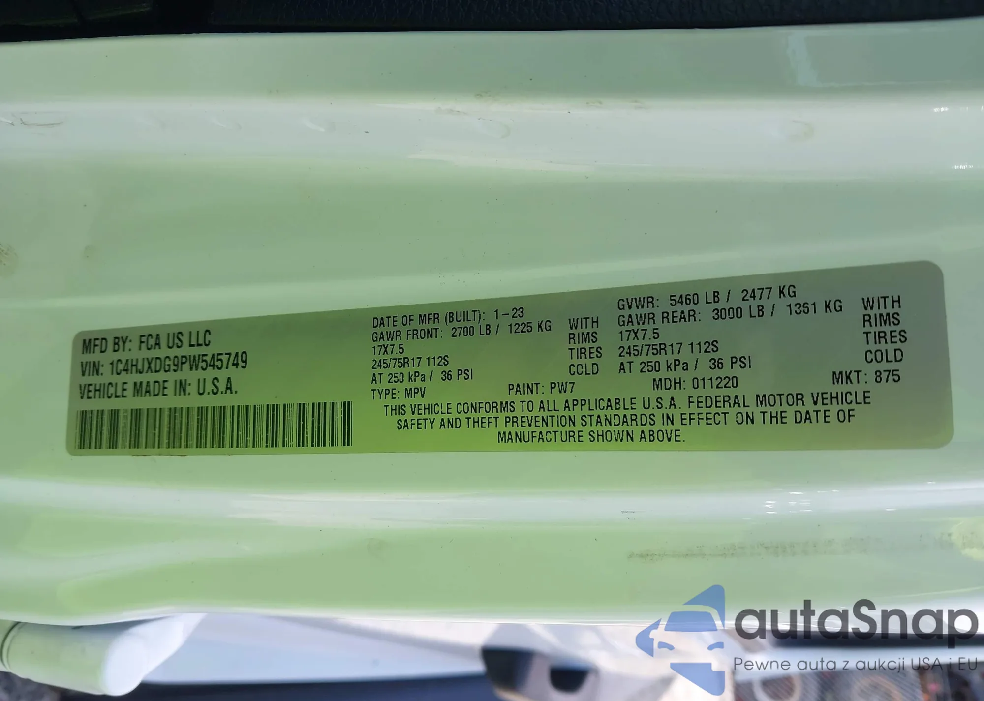 • VIN 1C4HJXDG9PW545749