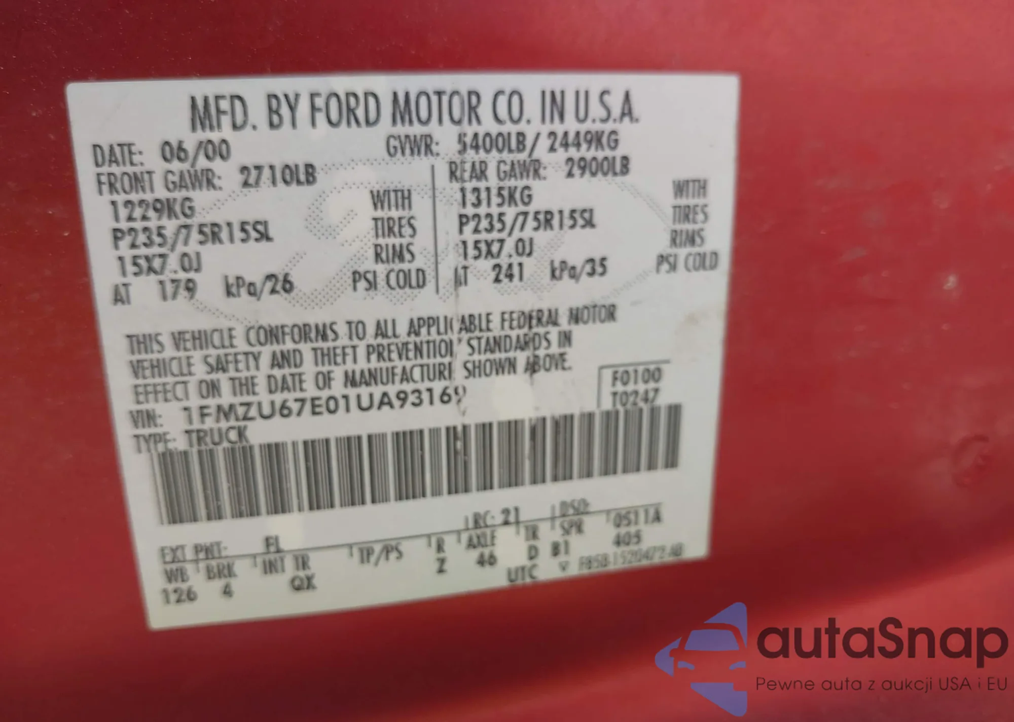 • VIN 1FMZU67E01UA93169