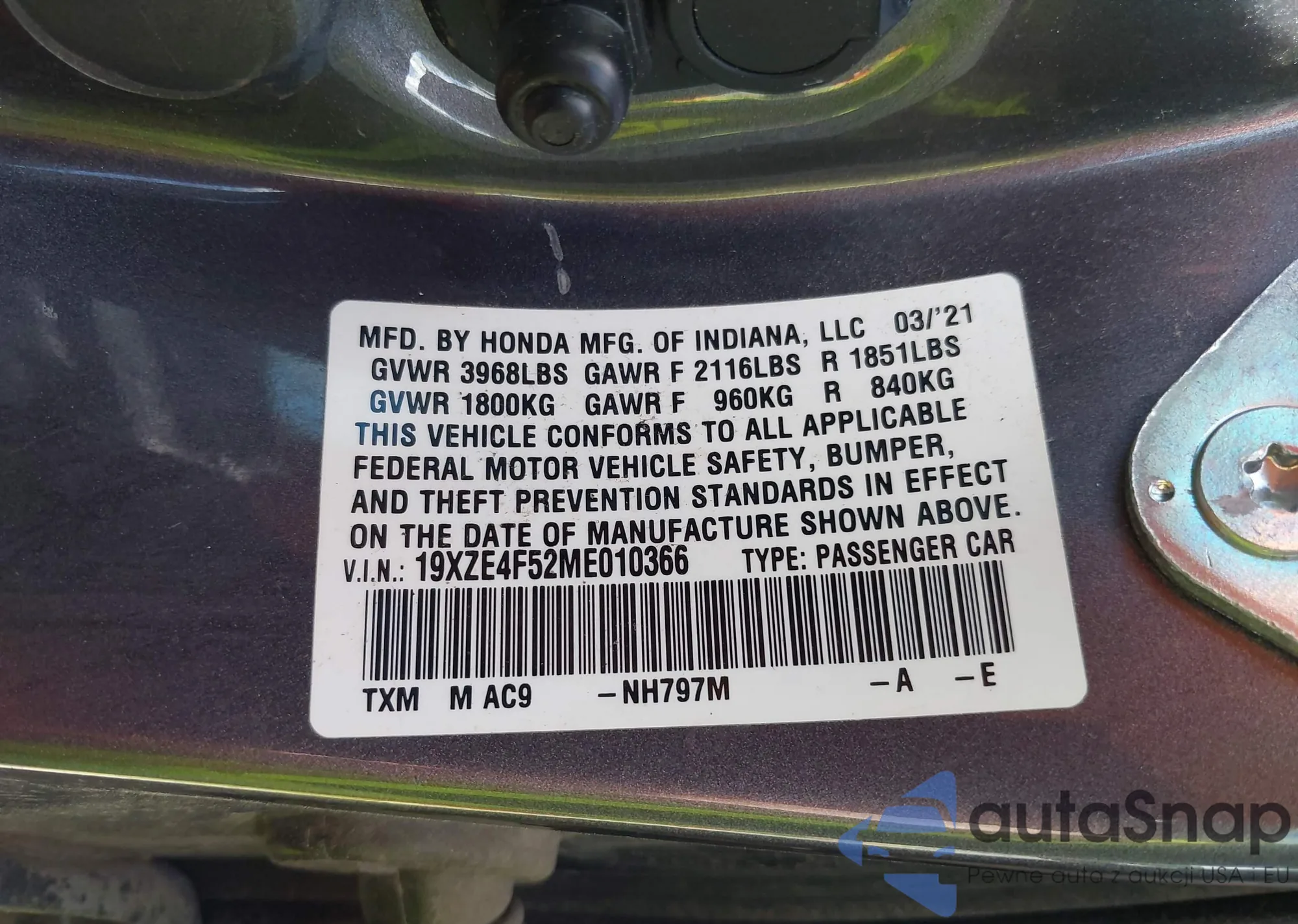 LOT: 42681061 VIN: 19XZE4F52ME010366