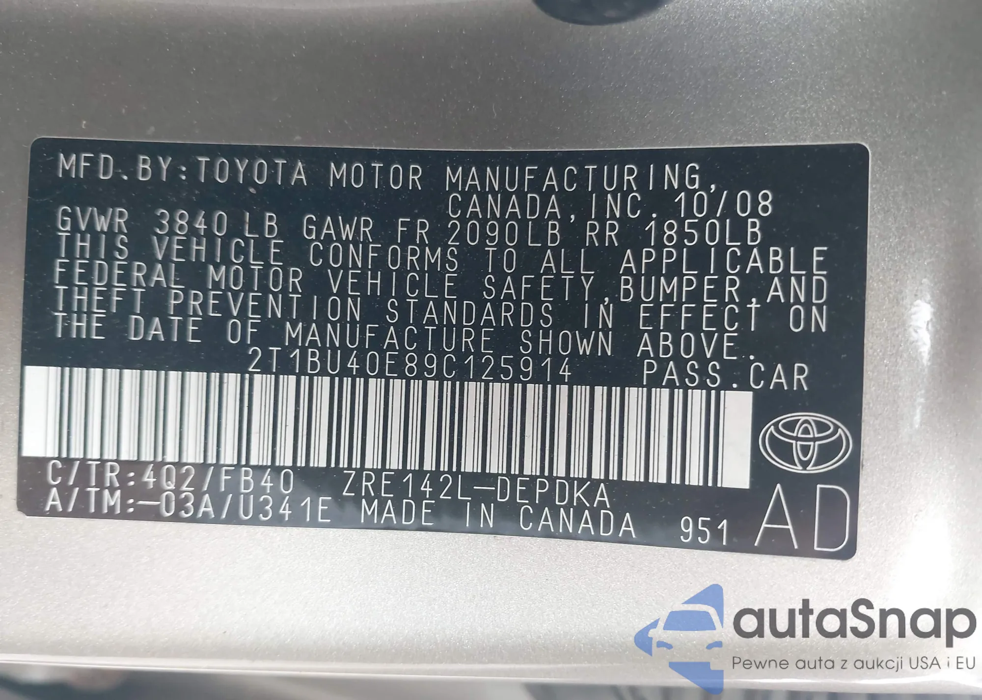 • VIN 4T1BE46KX9U811980