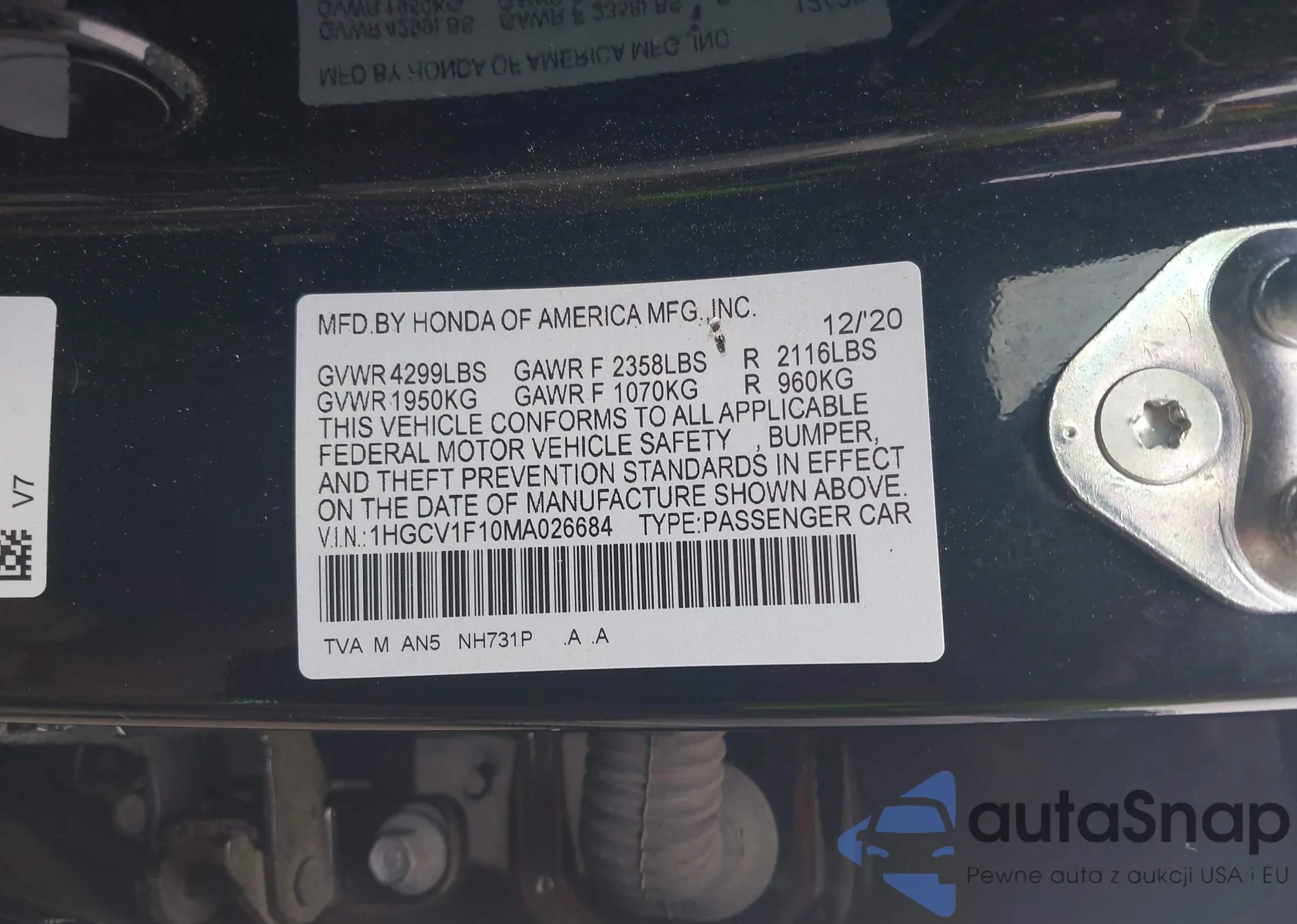 LOT: 42365307 VIN: 1HGCV1F10MA026684