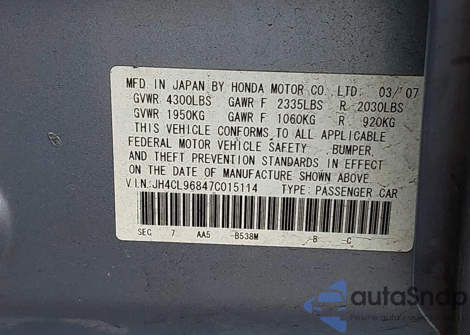• VIN JH4CL96847C015114