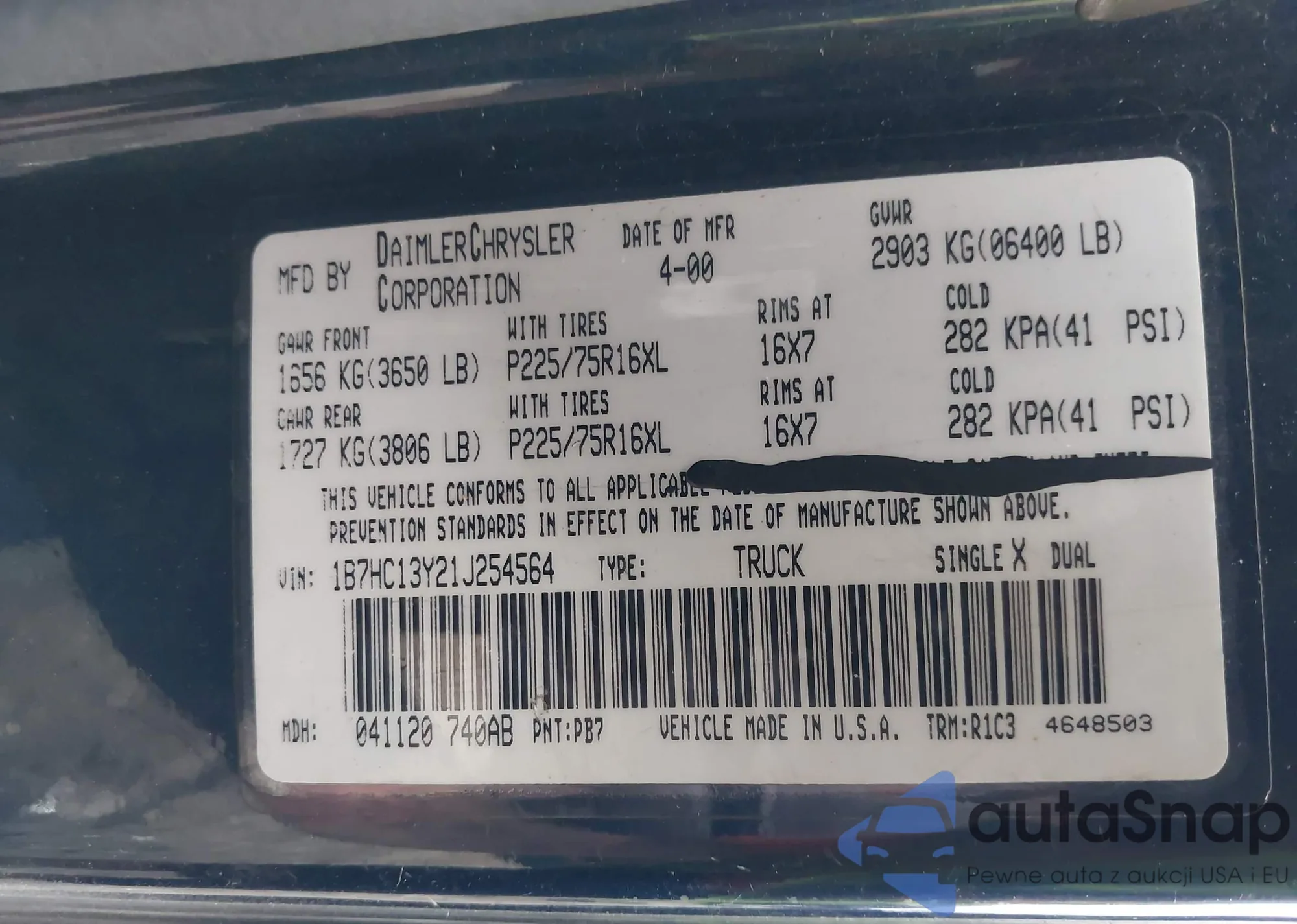 • VIN 1B7HC13Y21J254564