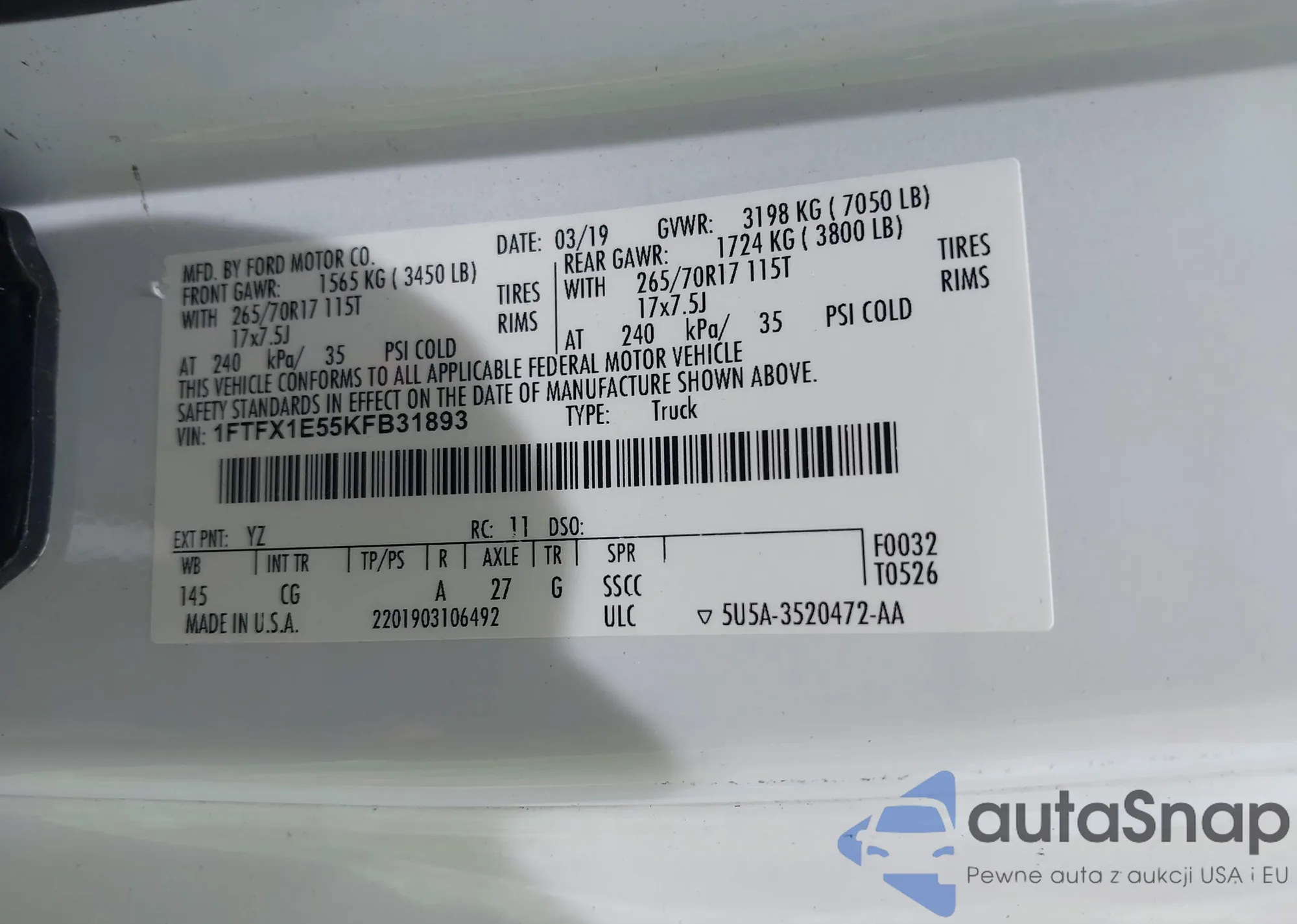 • VIN 1FTFX1E55KFB31893