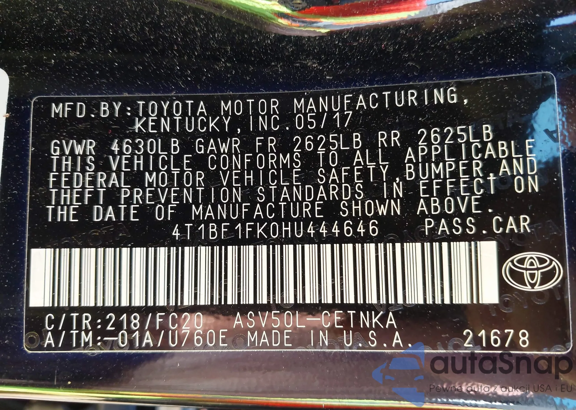 • VIN 4T1BF1FK0HU444646