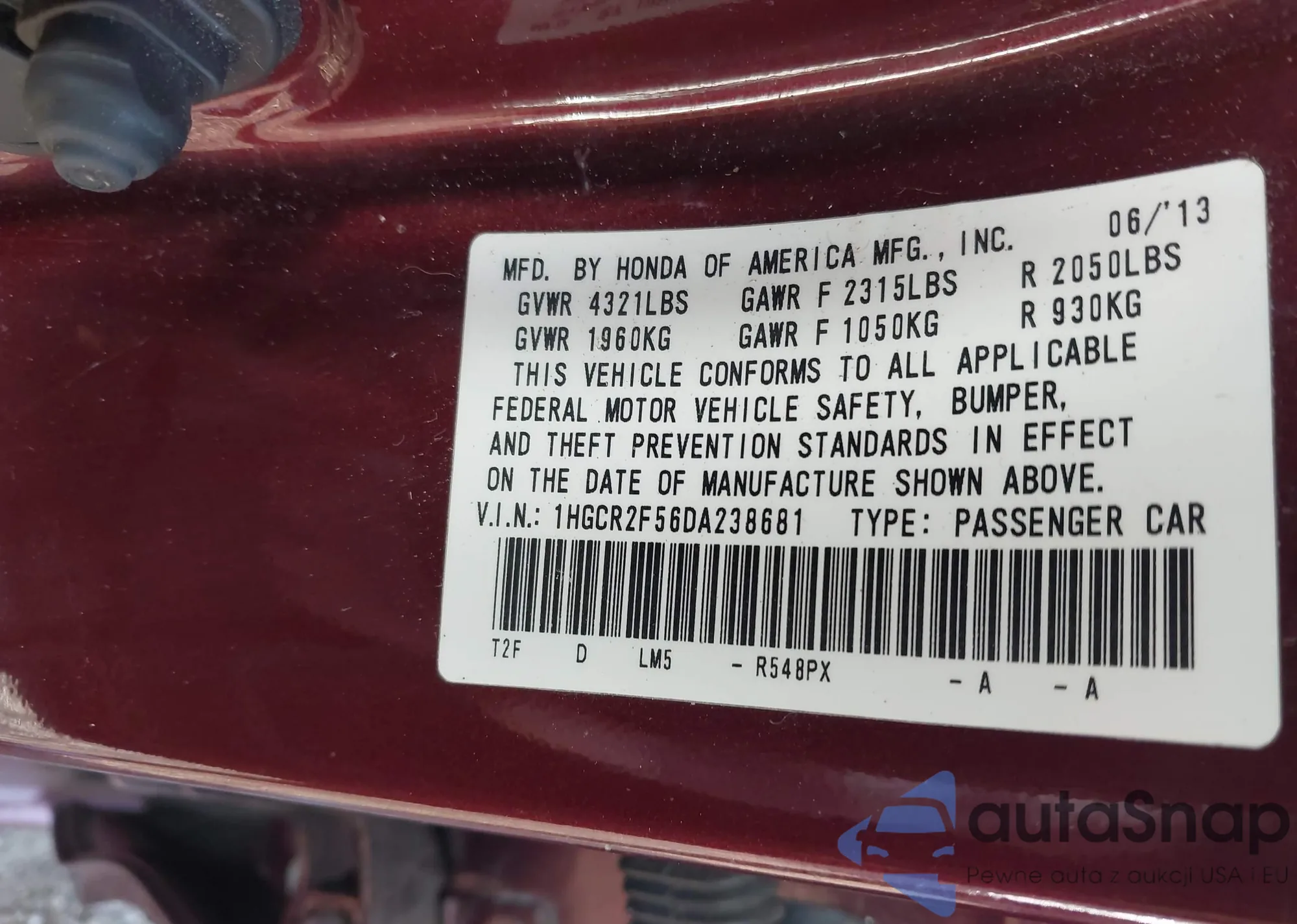 LOT: 42786352 VIN: 1HGCR2F56DA238681