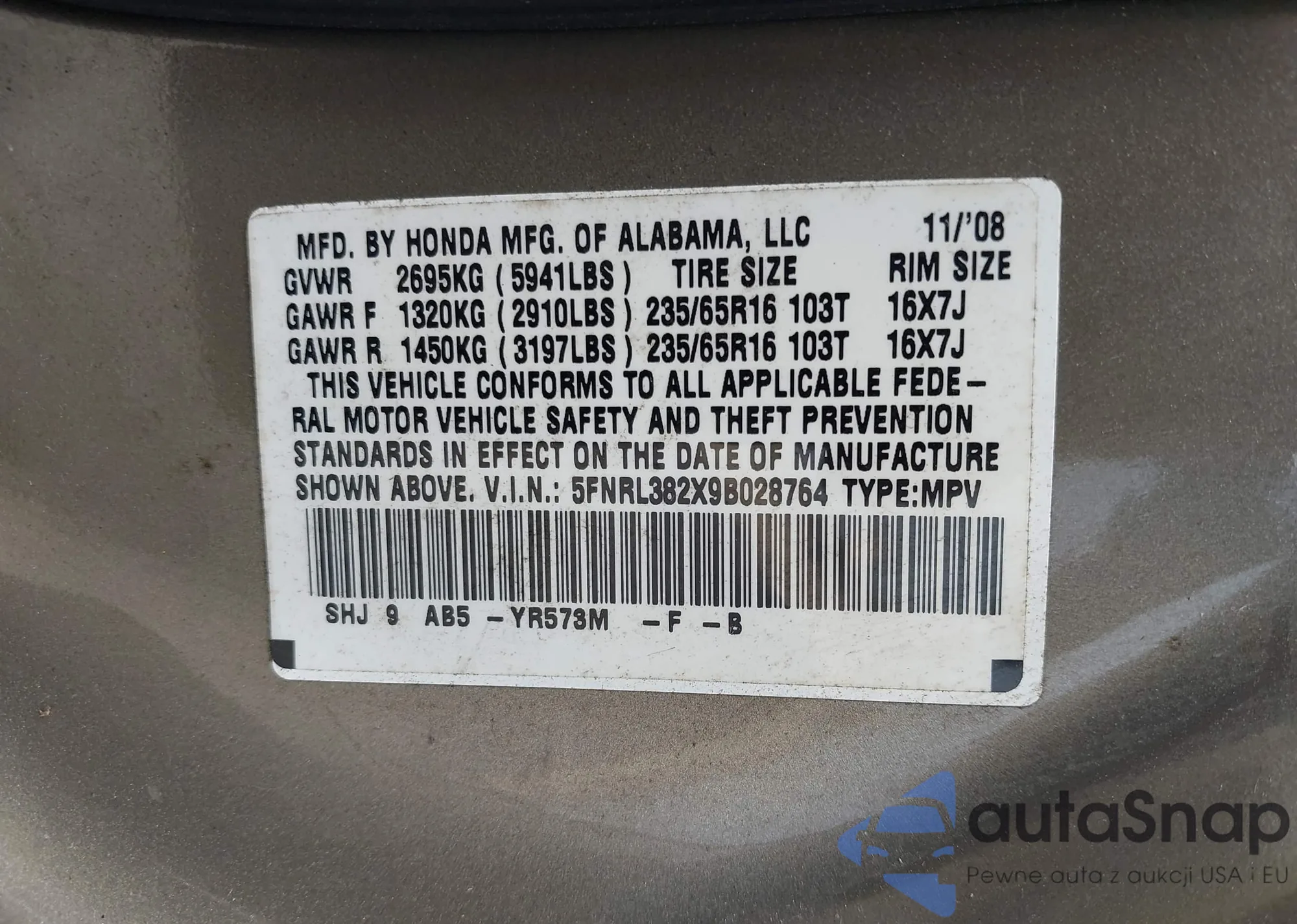 • VIN 5FNRL382X9B028764